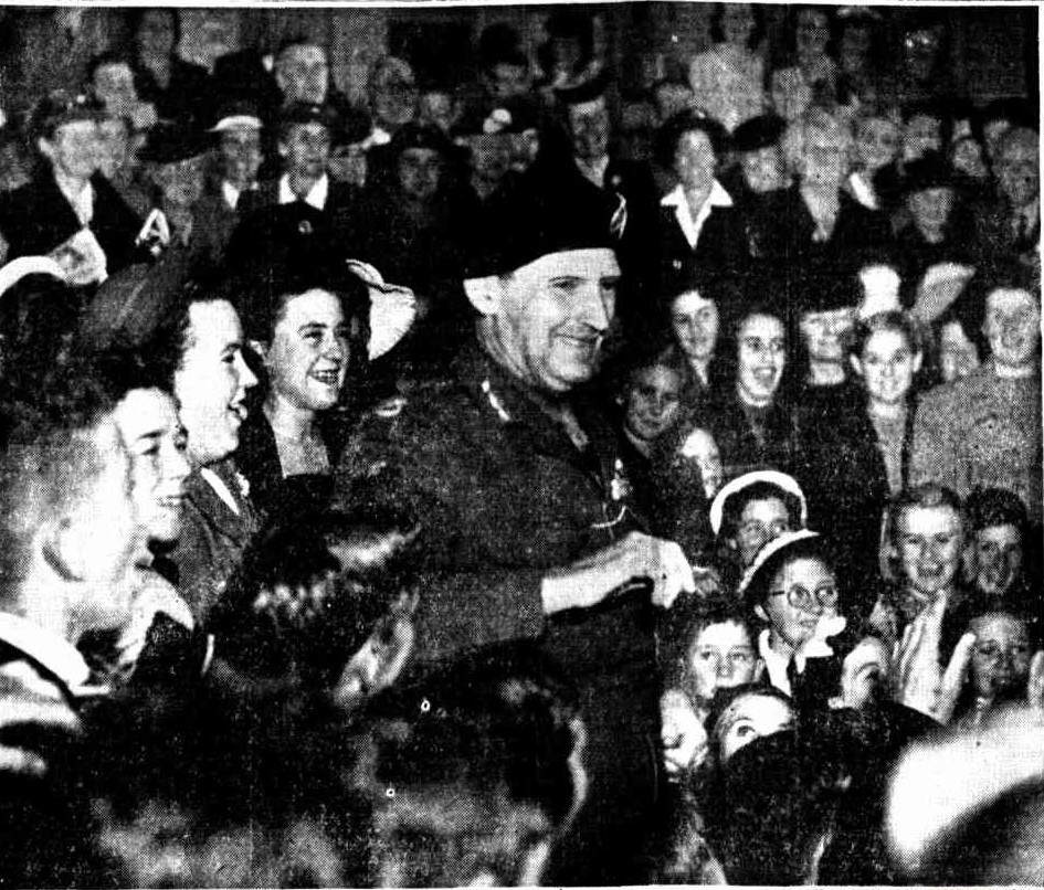 Mrs. Harkness showed Lord Montgomery a letter card. "We were playmates in Tasmania," she said. "We called him Bertram. I called him that to-day, but I don't know whether he recognised me. He wanted to keep the letter, which was written by his mother to my mother. I wouldn't let him." ****