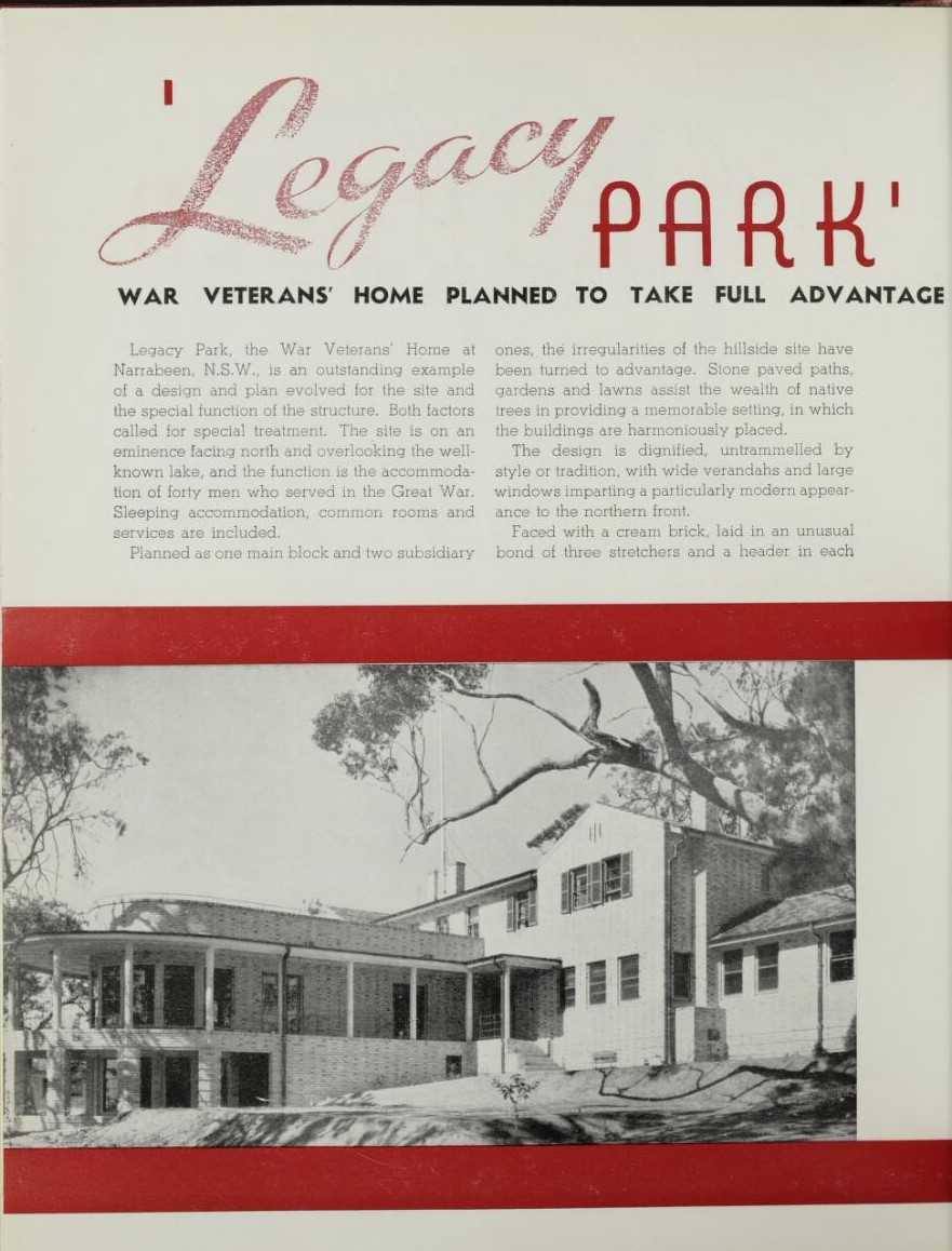 The remainder of the buildings will be separate cottage blocks scattered around the attractive grounds of 11 1/2 acres overlooking Narrabeen Lakes; the site was made available by the Warringah Shire Council. Two of the ultimate ten cottage blocks are being built under the initial contract, which it is understood is in the vicinity of £15,000. WAR VETERANS' HOME, NARRABEEN, SYDNEY. (1938, September 7). Construction (Sydney, NSW : 1938 - 1954), p. 5. Retrieved from http://nla.gov.au/nla.news-article222852810