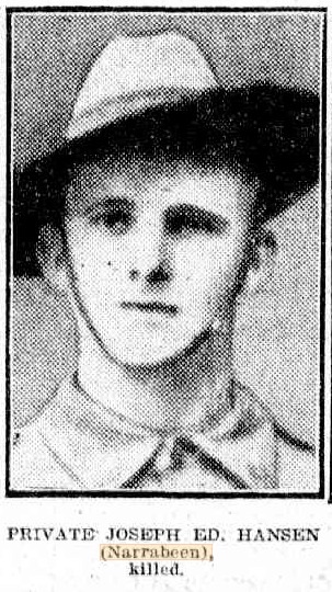 PRIVATE JOSEPH ED. HANSEN (Narrabeen), killed. HEROES OF THE DARDANELLES. (1915, July 1). The Daily Telegraph (Sydney, NSW : 1883 - 1930), p. 9. Retrieved from http://nla.gov.au/nla.news-article238921751