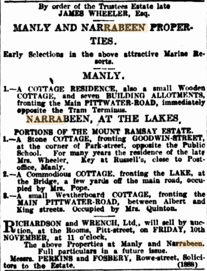 IN THE ESTATE OF MRS. MARIA MEGSON. RICHARDSON and WRENCH, Ltd., will sell by auction, at the Rooms, 02 Pitt-street, on FRIDAY, 10th November, at 11.30 a.m., The above Cottage, facing the Main Road at Narrabeen, close to the TRAM TERMINUS and the BUSINESS CENTRE at the BRIDGE. Advertising (1917, November 12). The Sydney Morning Herald (NSW : 1842 - 1954), p. 3. Retrieved from http://nla.gov.au/nla.news-article15735218