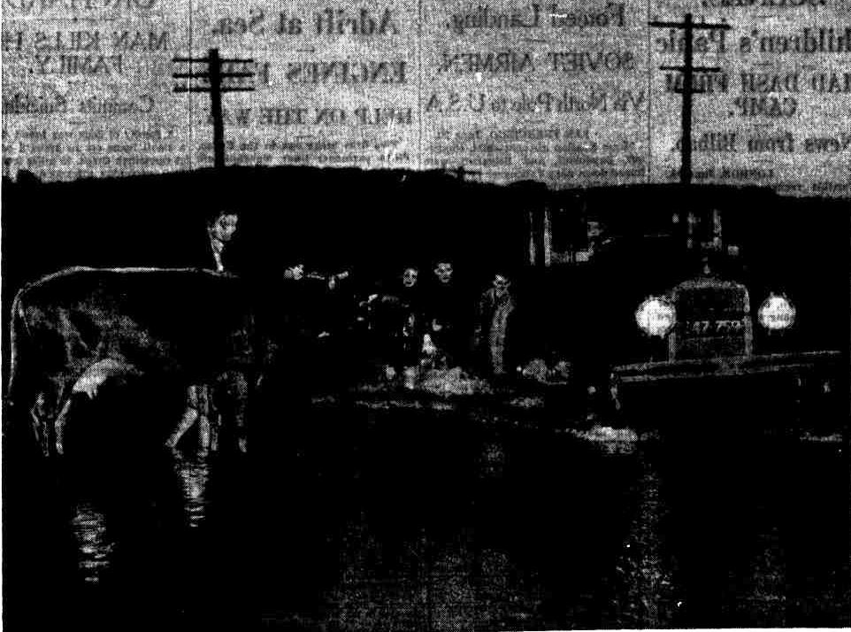 "They officially gave us 168 points, but ,i think it should have been 668 points," said one man gloomily, as he looked out on chicken coops floating in the backyard of his home. Water crept across paddocks; it blotted out roads leading from the beach; it rippled through fences, set stacks of firewood floating between back verandahs and garages, and lapped the bridge on the main road, asphalt midway in its wet grip. There as no surging of waters, no rumbles or rescues or plashing of oars or shouting of men la boats. They just awoke, in houses skirting the lagoon, yesterday, to find fishes playing round the roofs of kennels where Fido should have frisked. This was too much.-The challenge of the expanding lagoon, with its silent Insidious creep of waters was accepted!