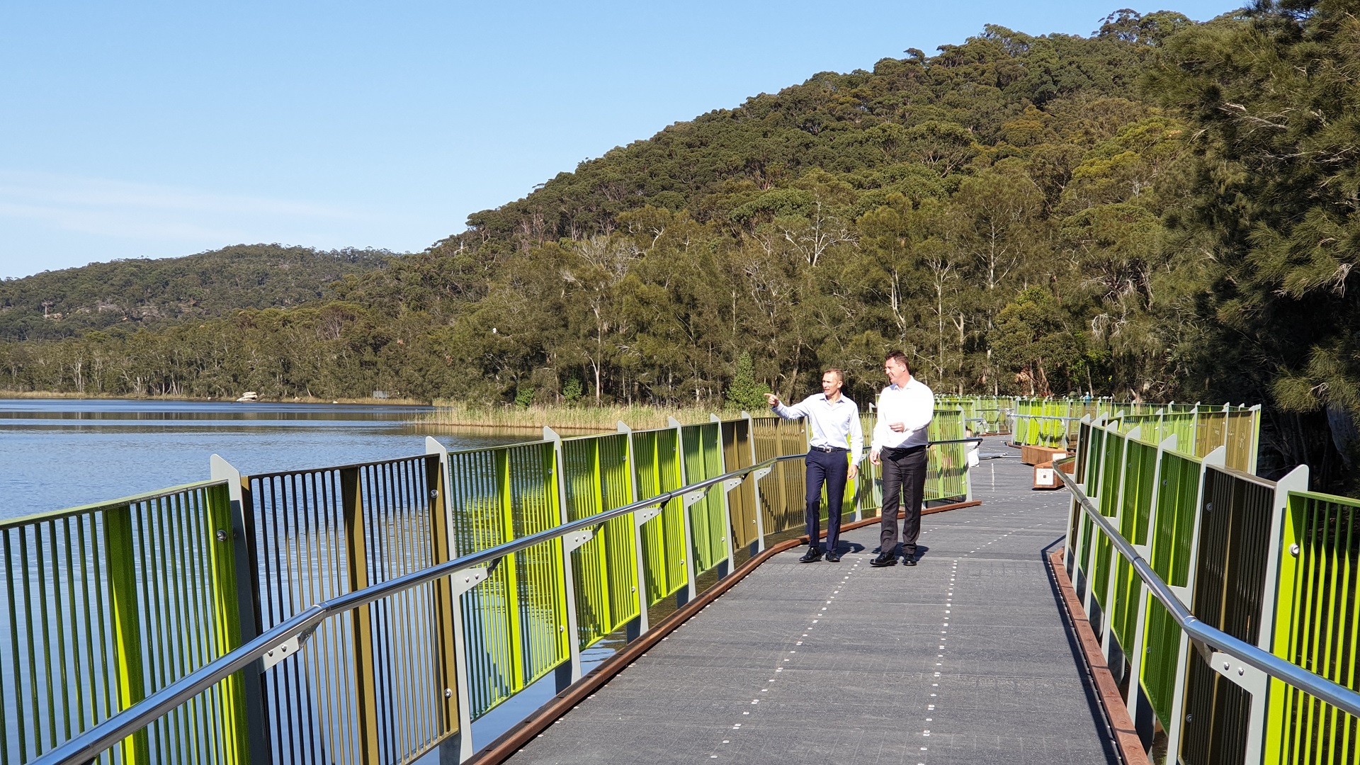 The Hon. Rob Stokes with Mayor Michael Regan further down the lagoon on the newly installed boardwalk