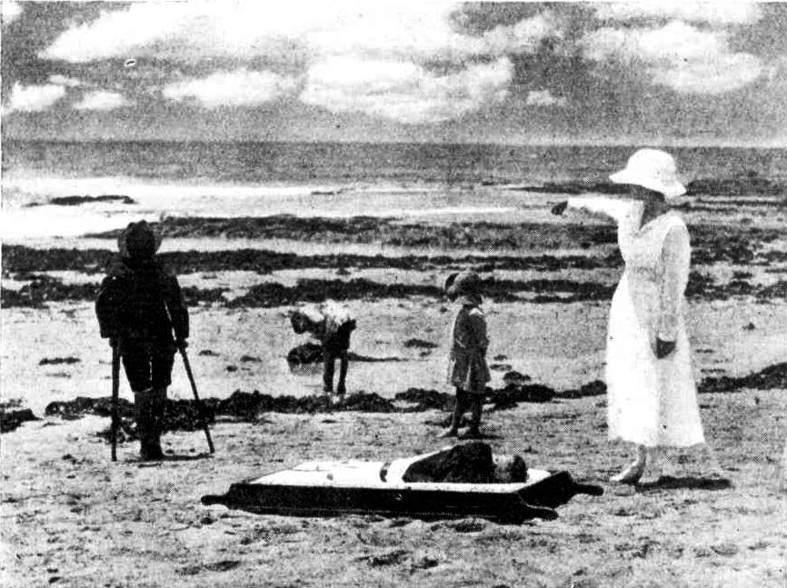 The new Convalescent Home which has been opened at Collaroy in connection with the Royal Alexandra Hospital for Children possesses an ideal situation. It is built on the top of the headland overlooking Long Reel beach, and the view includes the whole coastline from Collaroy to Barrenjoey, and on a clear day the headlands on the other side of Broken Bay. All this — the golden sands, white-crested waves, blue sky. green sea, the red-roofed houses nestling in the trees, and the purple coast in the far distance — goes to make up the view seen from tho big verandah on which the patients live — for they all sleep out. This verandah is large enough to hold three rows of beds, each row holding about ten. The floor is raised, and therefore the back row gets just tho same view as the front, and there is no jealousy or neck craning. The doings of the people on the beach are always of interest, and there is invariably something fresh to look at. There is, however, a prospect of this view being lost, as a house is to be built on an adjoining block. An effort is being made to buy the land in the Interests of the institution — but a sum of £700 is required. When it is warm the children play on the beach, sunbake— lying quite naked behind specially constructed screens — paddle, or even bathe in the rock pool. All this is possible only a few minutes walk from the building. FOR CONVALESCENT CHILDREN (1922, June 25). The Sun (Sydney, NSW : 1910 - 1954), , p. 5. Retrieved from http://nla.gov.au/nla.news-article223945010