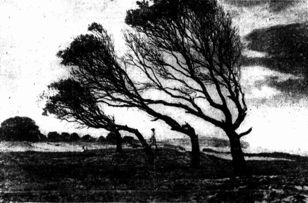 — Special by "The Sun" photographer. Salt spray and lashing wind have transformed the youth and slender straightness of these trees into age which is gnarled and twisted. The four of them together in their home on the edge of the sand have kept companionship through years of tempestuous wind and sea. They are guardians of the beach between Collaroy and Narrabeen — picturesquely silhouetted where few trees raise their heads to the sky. BESIDE THE WIND-SWEPT SEA (1923, May 13). The Sun (Sydney, NSW : 1910 - 1954), , p. 1. Retrieved from http://nla.gov.au/nla.news-article224105838