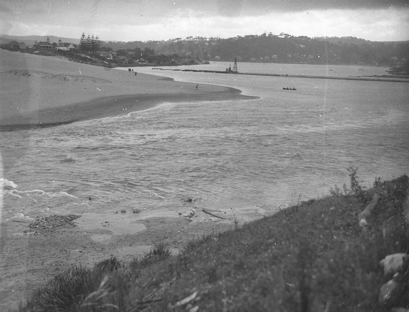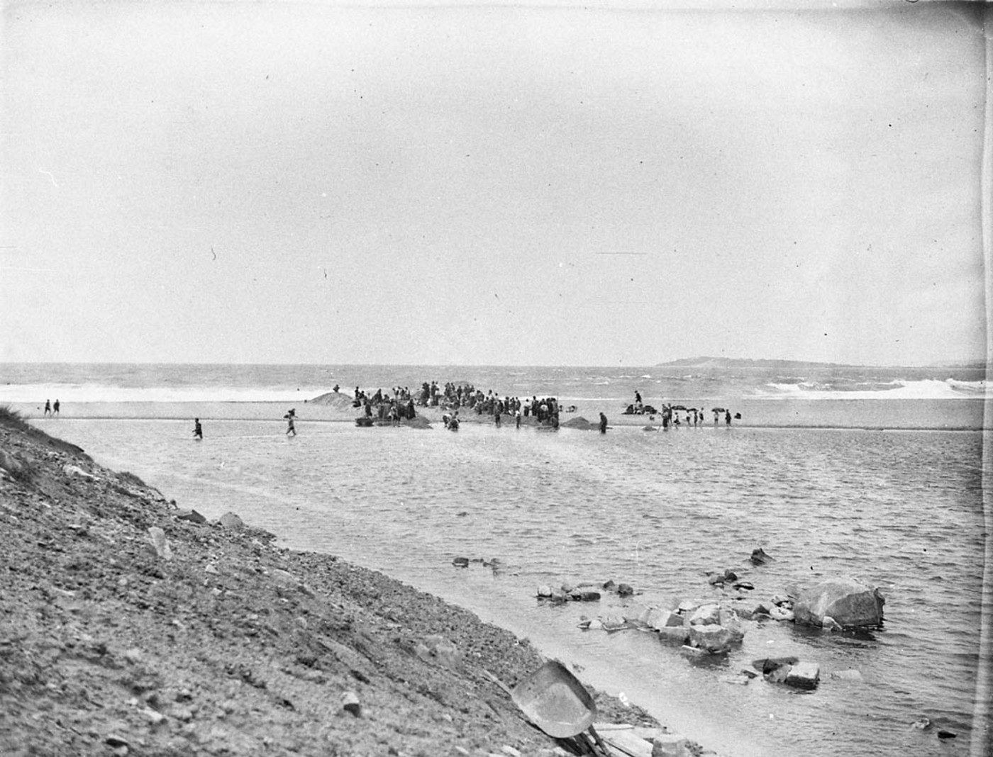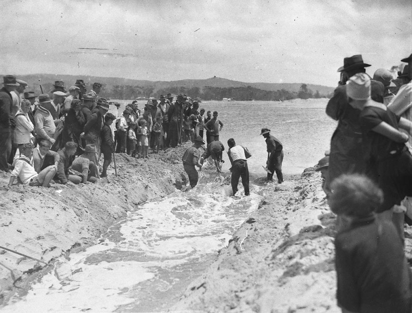 In spite of the strong north-east wind and driving rain which prevailed on Saturday, the beach at North Narrabeen was the scene of much activity. About 20 workers and a hundred spectators were gathered there for the purpose of assisting in the witnessing of cutting of a channel through the sand to release the surplus waters of the lake, by allowing them to flow into the sea.