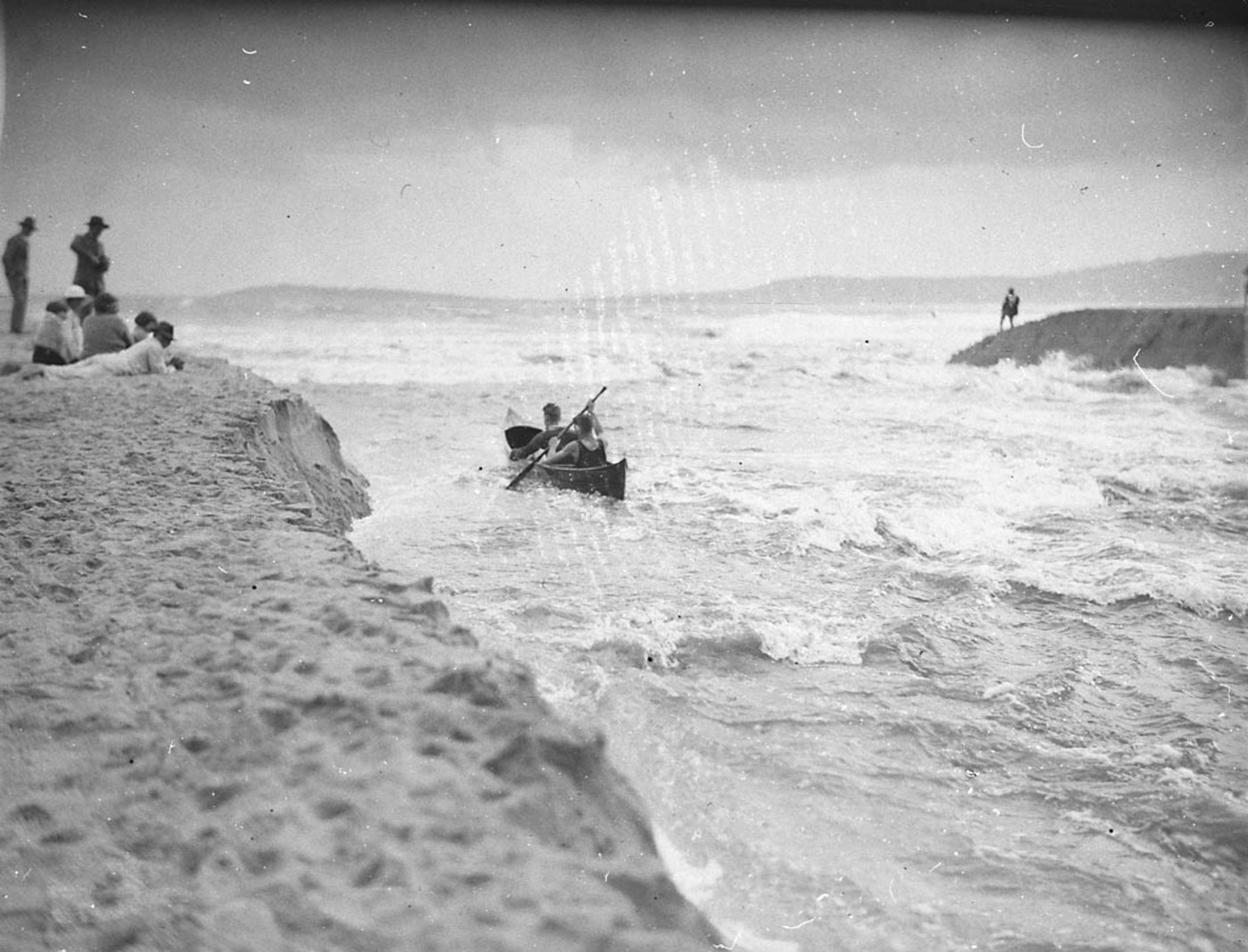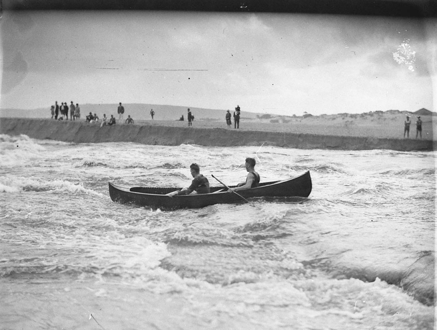 Two canoeists brave the rapids where Narrabeen Lake flood pours into the sea – Top one appeared in newspaper _06397h and _06404h, courtesy State Library of NSW