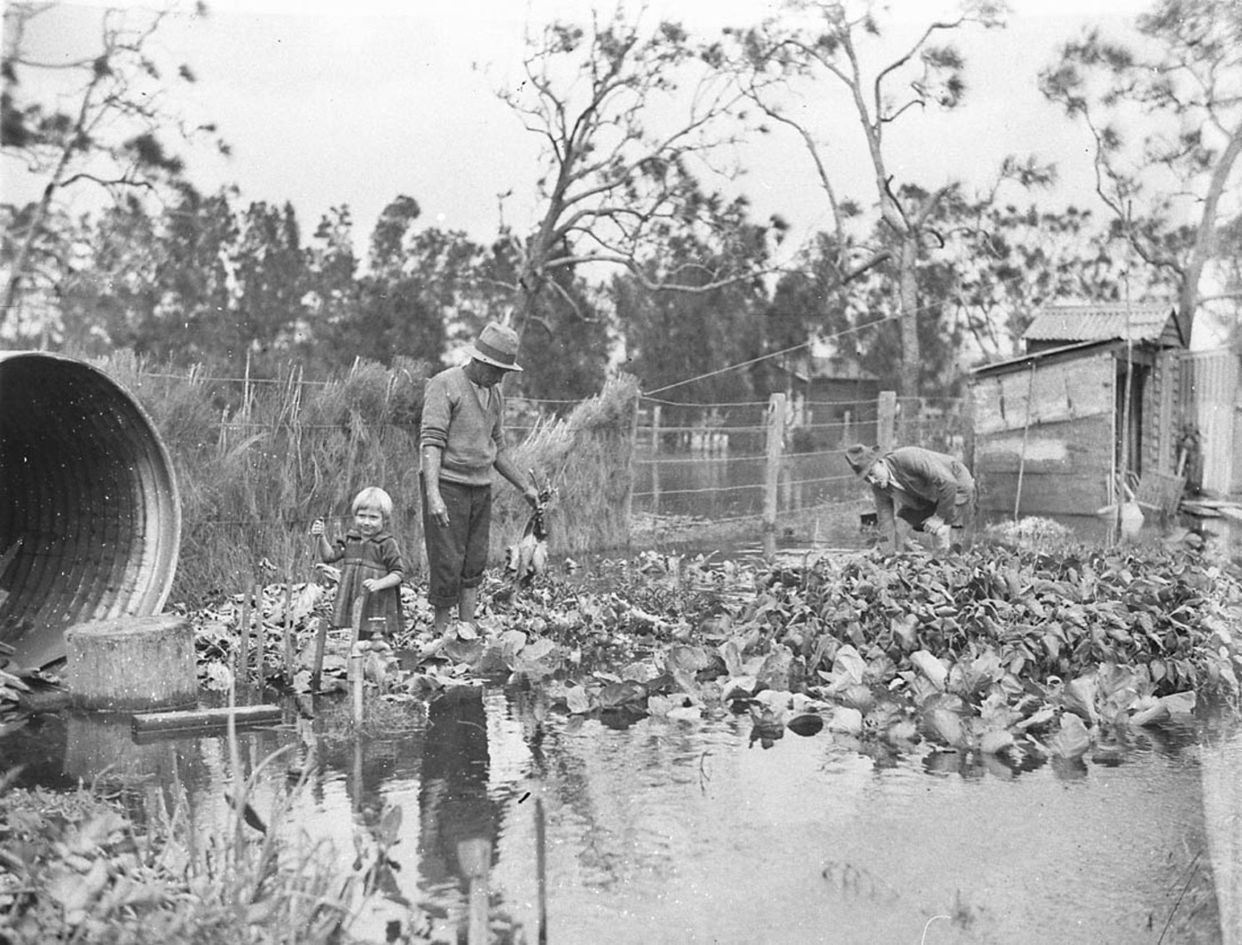 Man surveys his vegetable garden in the Narrabeen flood - Image. No: hood_06399, courtesy State Library of NSW