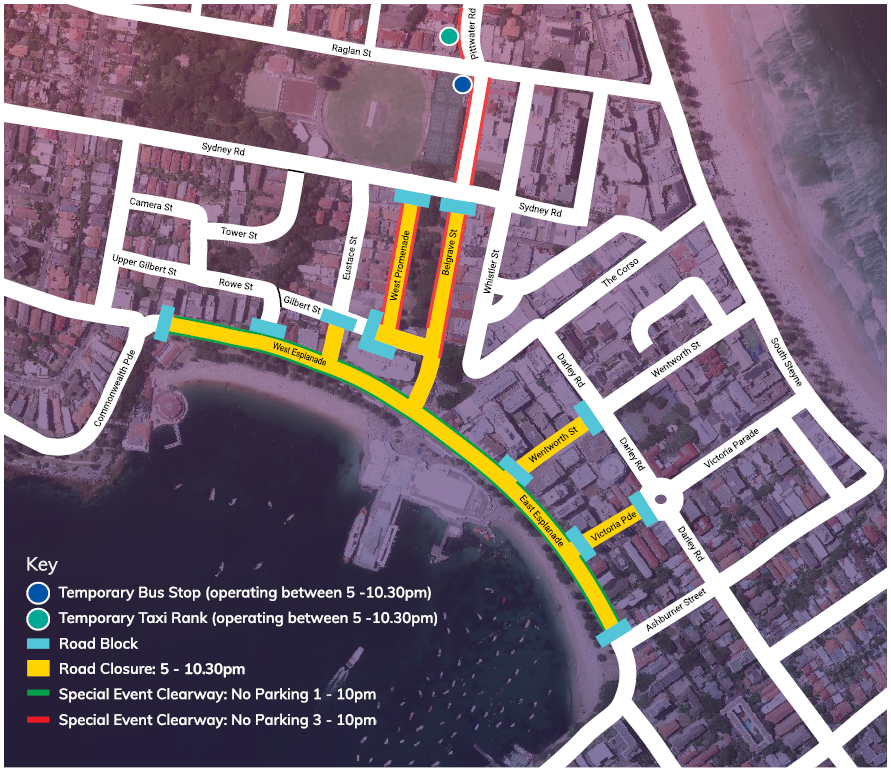 - Corner of Raglan Street and Pittwater Road - western side (from 3 -10pm)