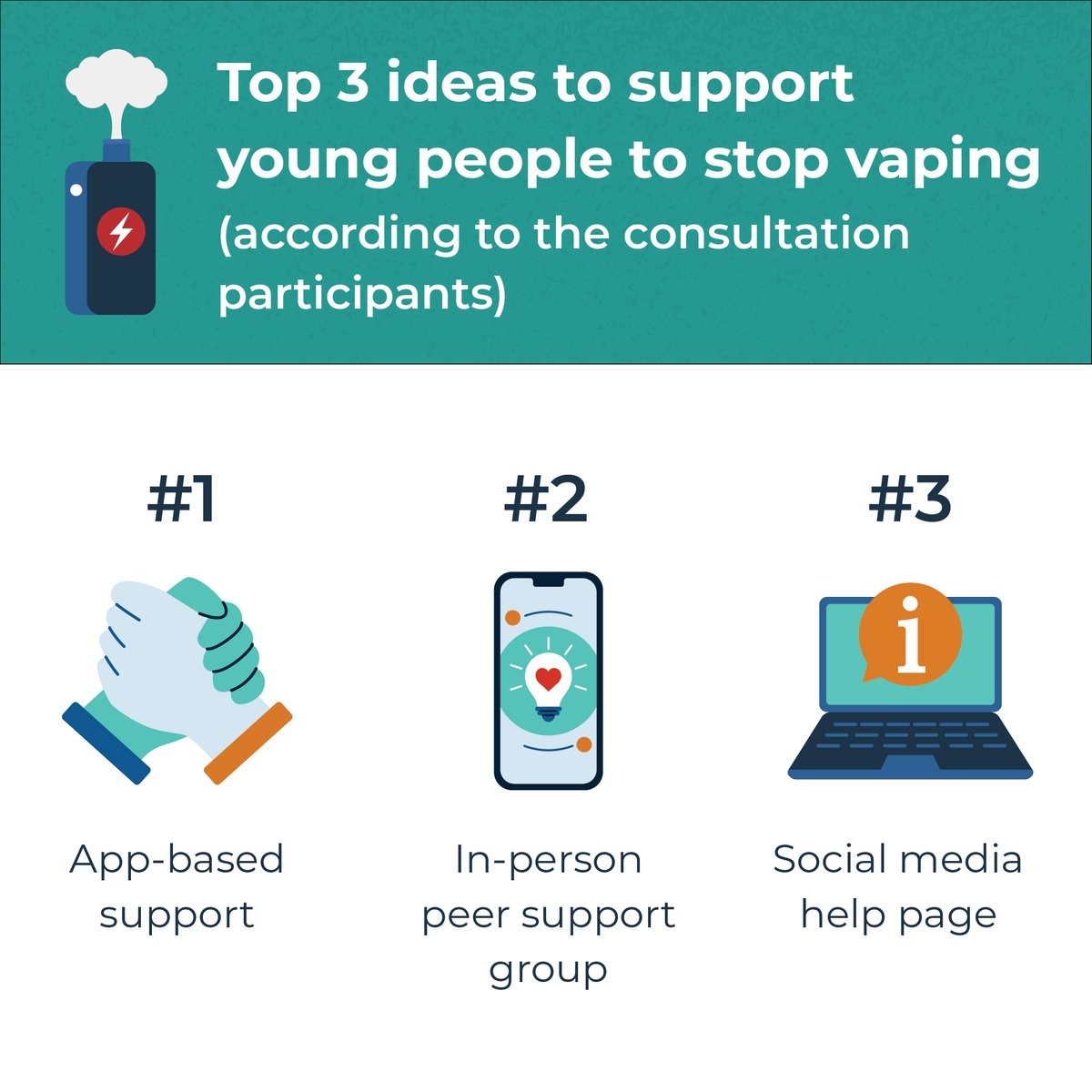 Young people who vape identified in-person support, nicotine gum or sports rather than “happy chemicals”, app-based support and banning vapes, social media based messaging as the top four supports they would access if they were available.
