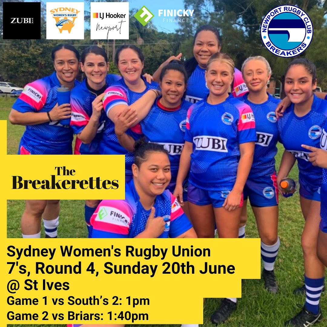The Breakerettes will be competing in Round 4 of the Sydney Women's Rugby Union 7's Series this coming Sunday, 20 June 21, at Hassel Park, St Ives.