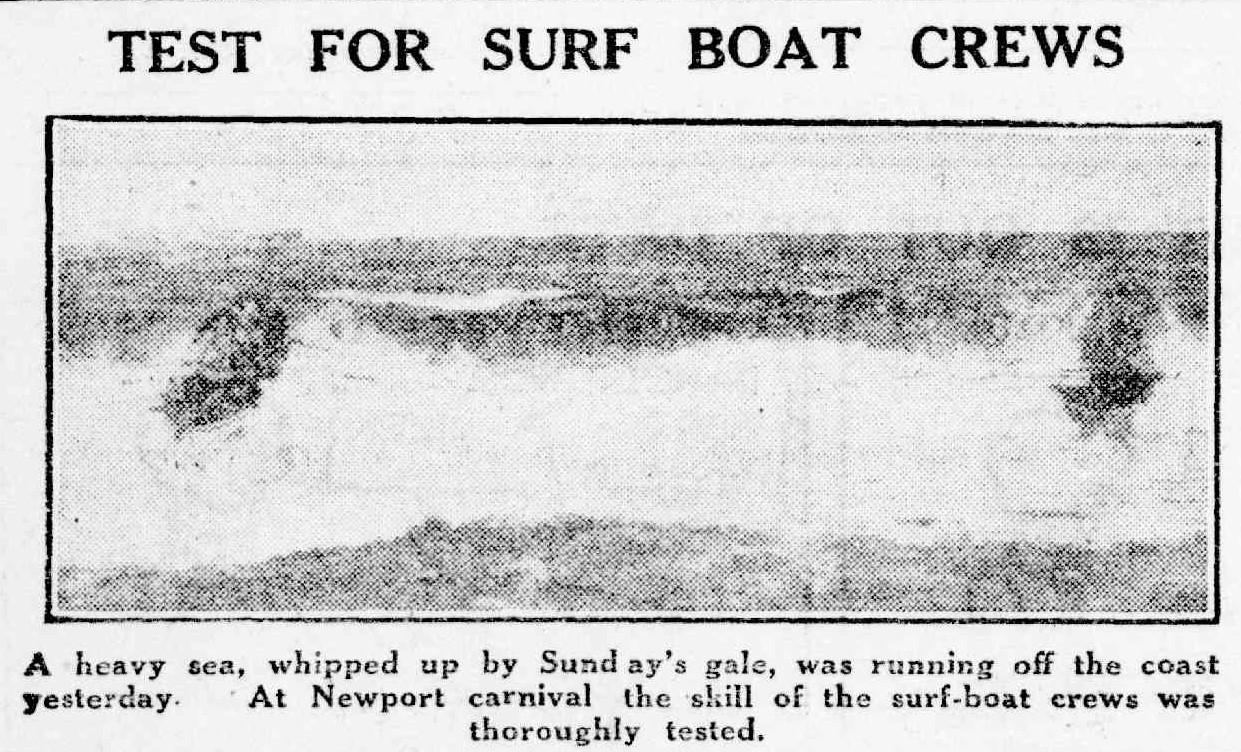 The Newport Surf Life Saving Club will launch Its new surf boat on Sunday. Presented by the local Ladles' Surf Club, the boat Is of the latest design, and will be specially valuable for competitive work. Newport expects to figure prominently boat races at future surf carnivals. With Empire Games oarsman E. R. Bromley, Olympian W. Jordan and King's Cup representative, J. Burrell, the club has the material for a fine crew. NEWPORT'S NEW SURF BOAT (1939, January 12). Daily News (Sydney, NSW : 1938 - 1940), p. 10. Retrieved from http://nla.gov.au/nla.news-article236319436