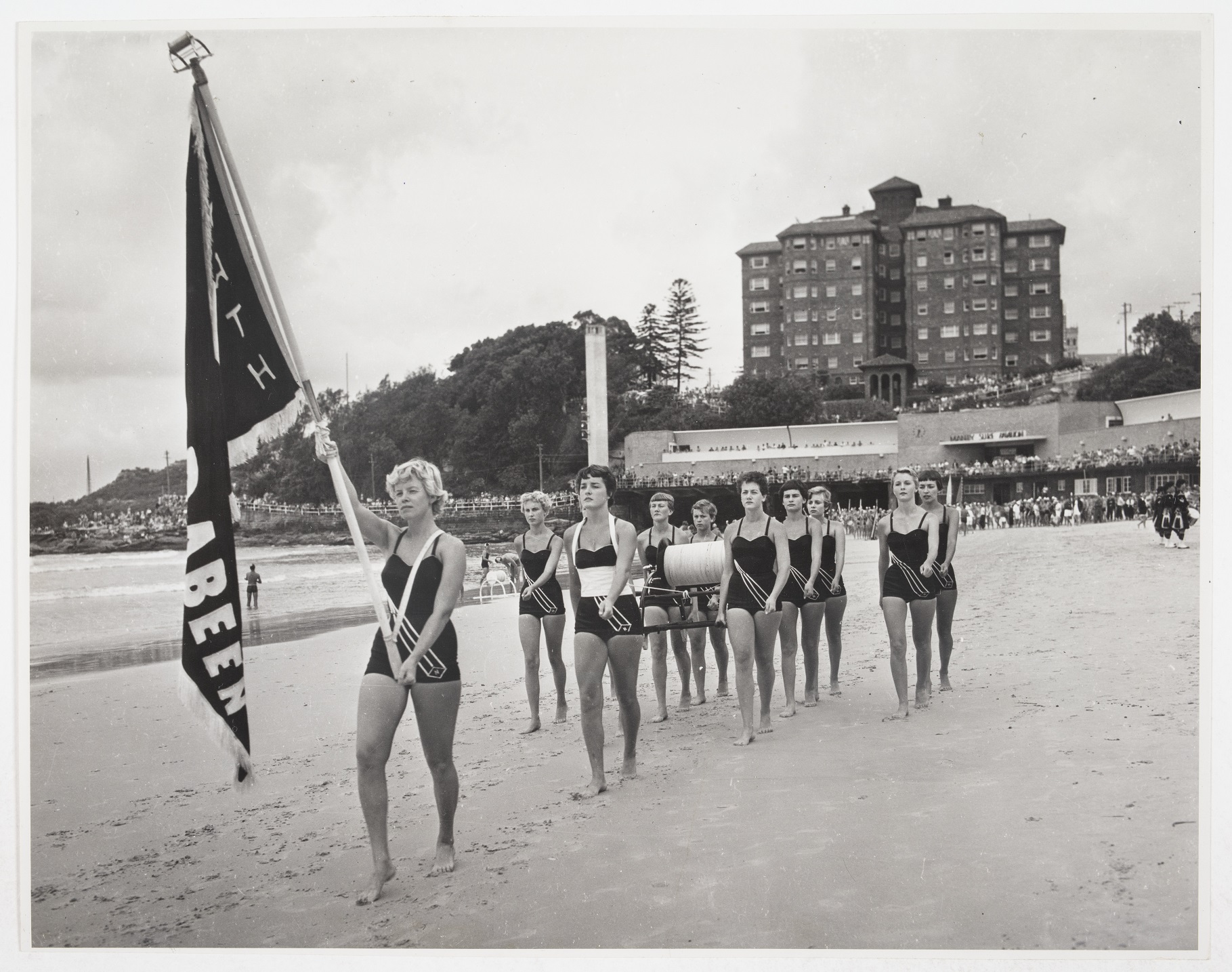 Maroubra and Narrabeen Women's Surf Life Saving Team in March Past, Manly Beach, dated July 1963 (possibly when used, obviously not when taken) / ANIB photo by J. Fitzpatrick