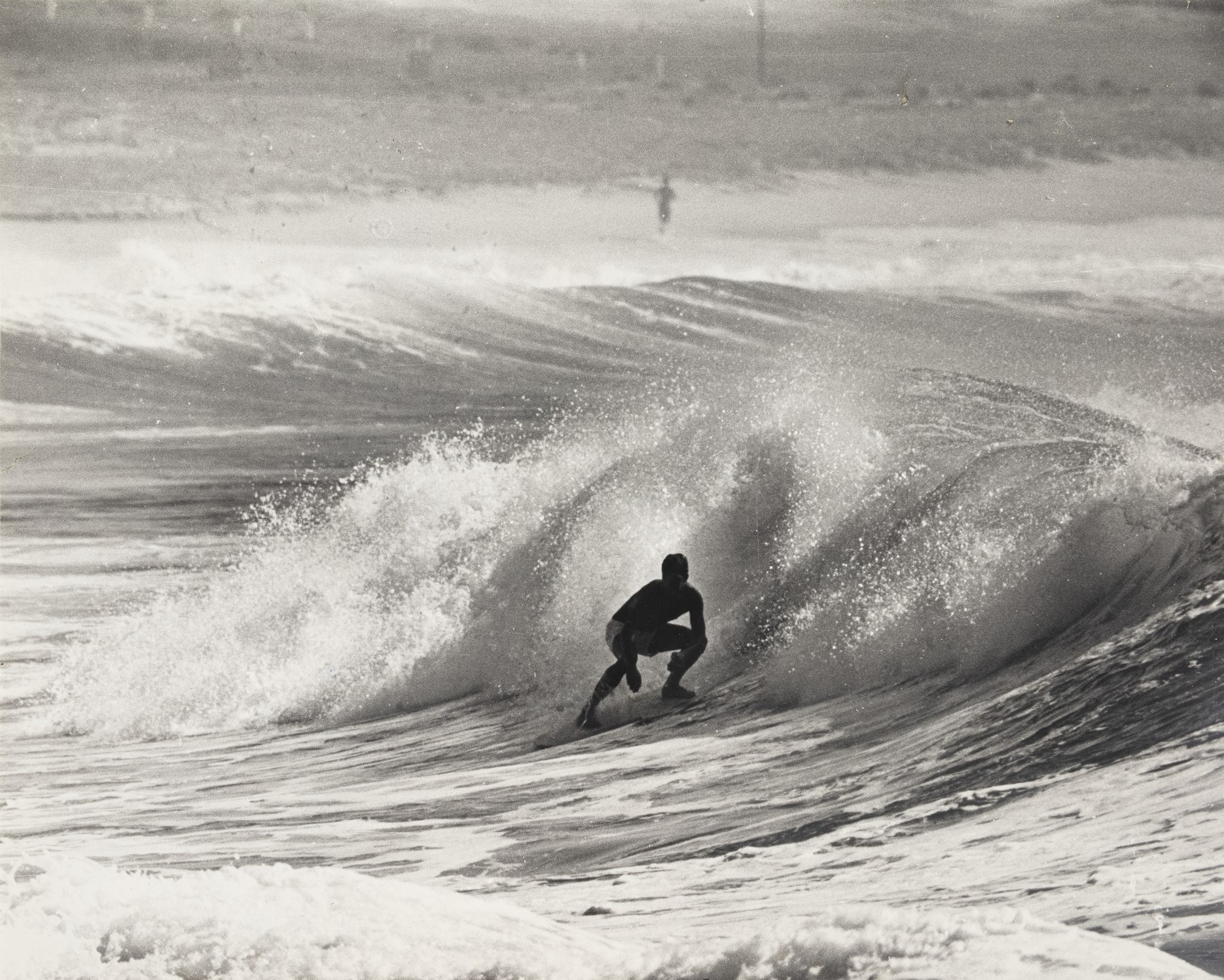 Midget Farrelly, world surfing champion surfing, no date or location, but obviously in 1964, and possibly at Fairy Bower, where he often surfed during these years and which is similar to other pictures of surfing at Fairy Bower in the album. Item: SLNSW_FL20059624, courtesy State Library of NSW and Tourism Australia