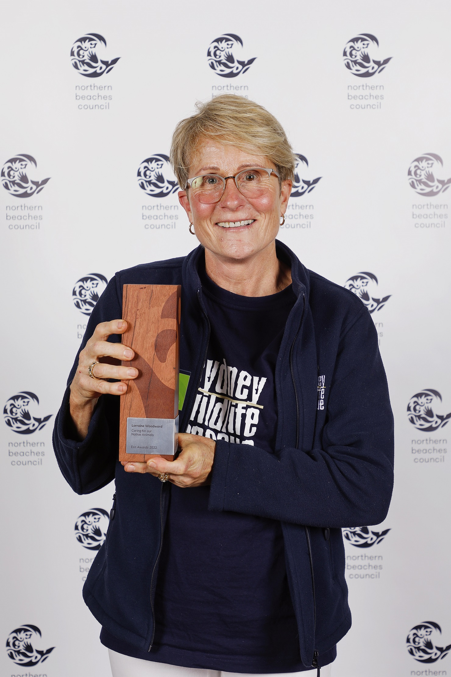 Caring for our Native Animals. Recognises individuals committed to protecting Northern Beaches native animals - marine and terrestrial. Individuals may be providing direct care for wildlife or indirectly, for example improving the ecological condition of key habitats, reducing the impact of pest species, or working to improve our wildlife corridors. Winner: Lorraine Woodward