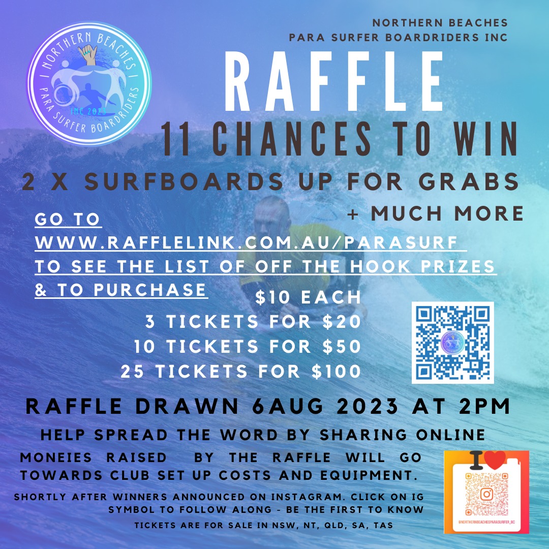 Currently we are running a raffle. All details of our amazing prizes and Raffle sponsors here - https://tr.ee/BuyRaffleTixWinOneOf2SurfboardsOrBoth or again at our main point of contact https://linktr.ee/nbparasurfer
