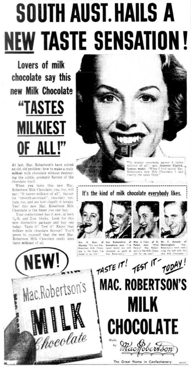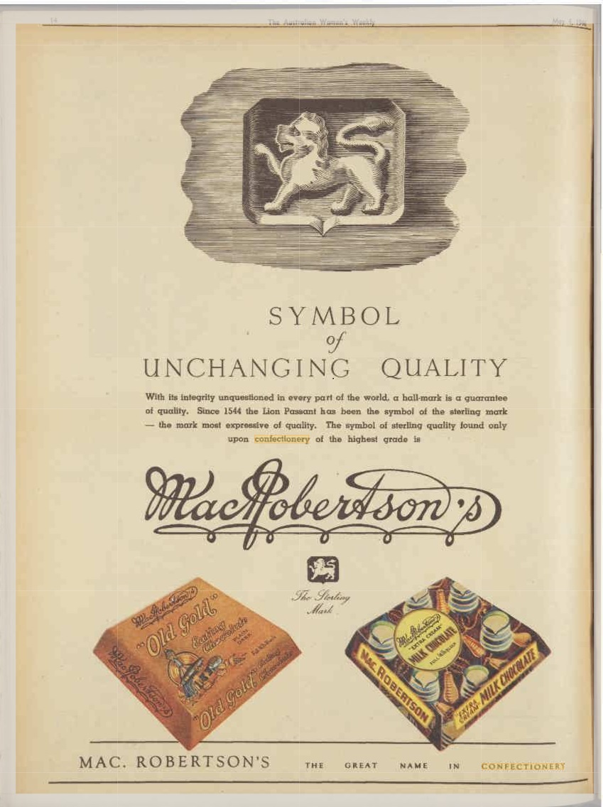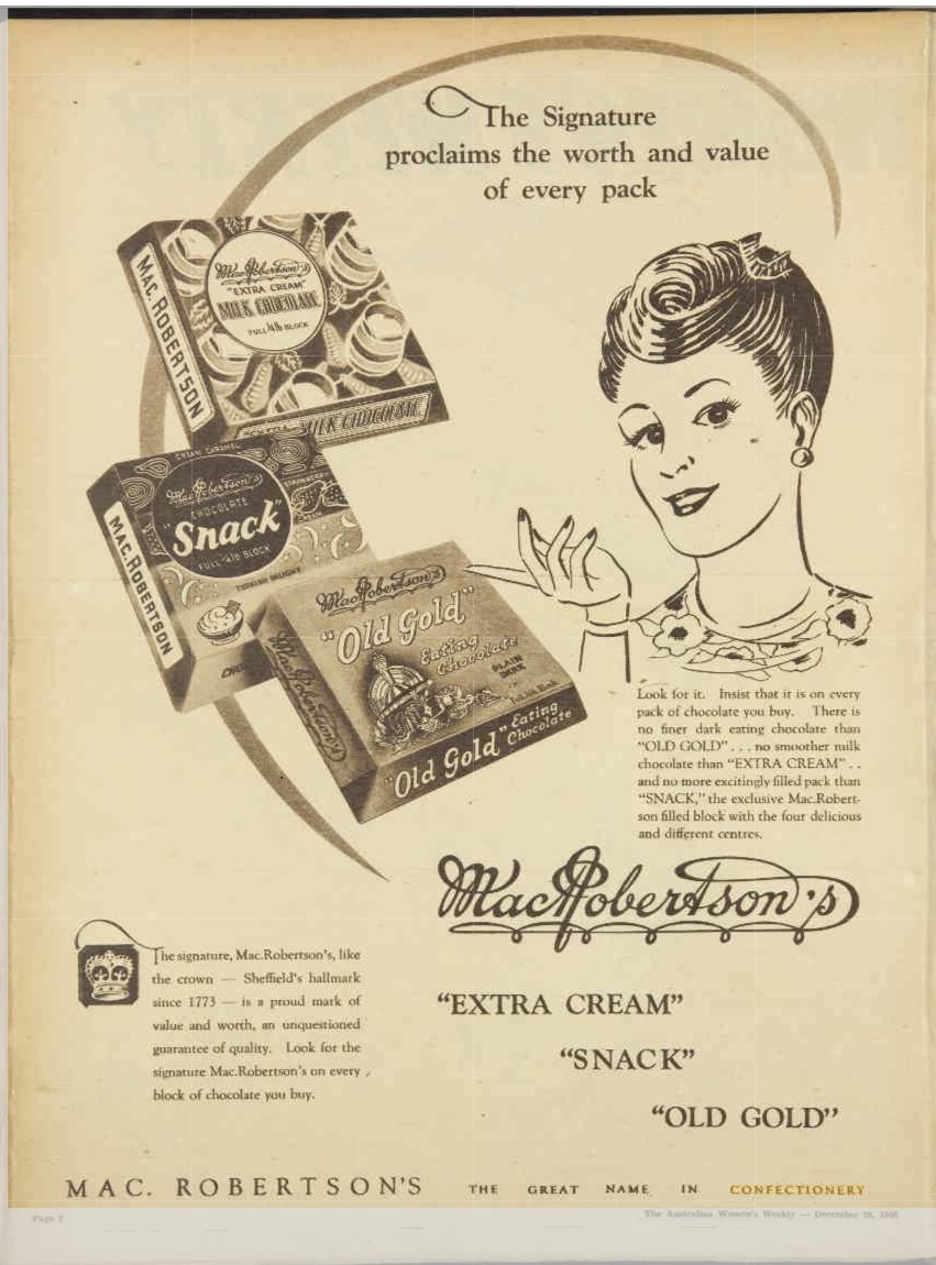 Mac. Robertson's extra quality means extra delight for your family. Extra pleasure for you, too, when you give Mac. Robertson's. So, for your sweetest Christmas ever, choose Mac. Robertson's. Advertising (1954, December 15). The Australian Women's Weekly (1933 - 1982), p. 48. Retrieved from http://nla.gov.au/nla.news-article44554989
