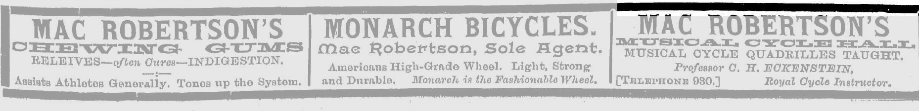Following is a list of the costumes : Miss R. Mahoney, MacRobertson's confectionery ; Miss Pim, Starry night ; Miss Rook, Cherry Ripe; Miss Murray, Dutch Cheese; Miss Ruth, Australia; …. APSLEY (1907, October 4). The Horsham Times (Vic. : 1882 - 1954), p. 2 (Supplement to the Horsham Times). Retrieved from http://nla.gov.au/nla.news-article72804243