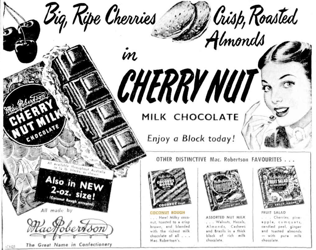 MacRobertson's confectioners were buying fruit for their jams prior to selling that part of the company off, and preserving fruit and using some of these, sultanas as one example, in their sweets from the late 1890's, especially their very popular mixed chocolates range, all smothered in Old Gold chocolate. By 1922 their chocolate covered maraschino cherries were a popular item. A maraschino cherry is a preserved, sweetened cherry, typically made from light-coloured sweet cherries such as the Royal Ann, Rainier, or Gold varieties.