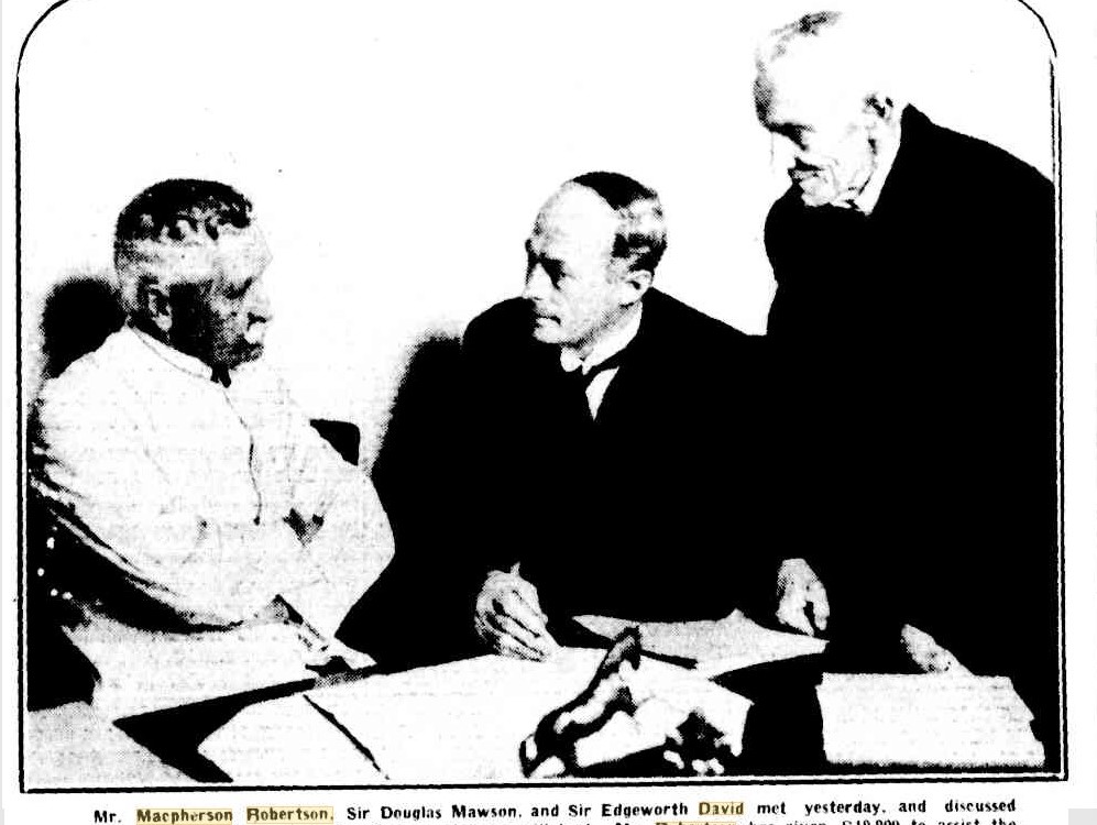 But so soon as he had made money he looked around to see what he could do to help his country. His benefactions have been enormous. Some years ago money was needed to equip the Sir Douglas Mawson expedition to the Antarctic. Mr. Bruce, then Prime Minister, and Sir Douglas, approached MacRobertson. He contributed the whole amount, £16,500.