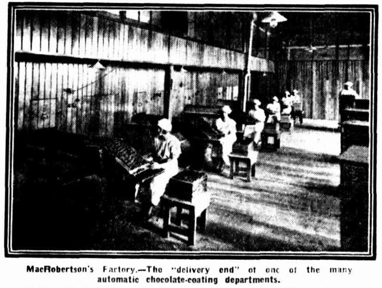 Fifty years ago yesterday Mr Mac Robertson began the manufacture of confectionery on the site in Fitzroy on which the great Mac Robertson confectionery factory now stands. To mark the jubilee of the foundation of the business his employees, numbering 2,600, gave him a great welcome at the works yesterday morning. He is shown addressing his employees. JUBILEE OF MAC ROBERTSON FACTORY. (1930, June 11). The Argus (Melbourne, Vic. : 1848 - 1957), p. 5. Retrieved from http://nla.gov.au/nla.news-article4092736