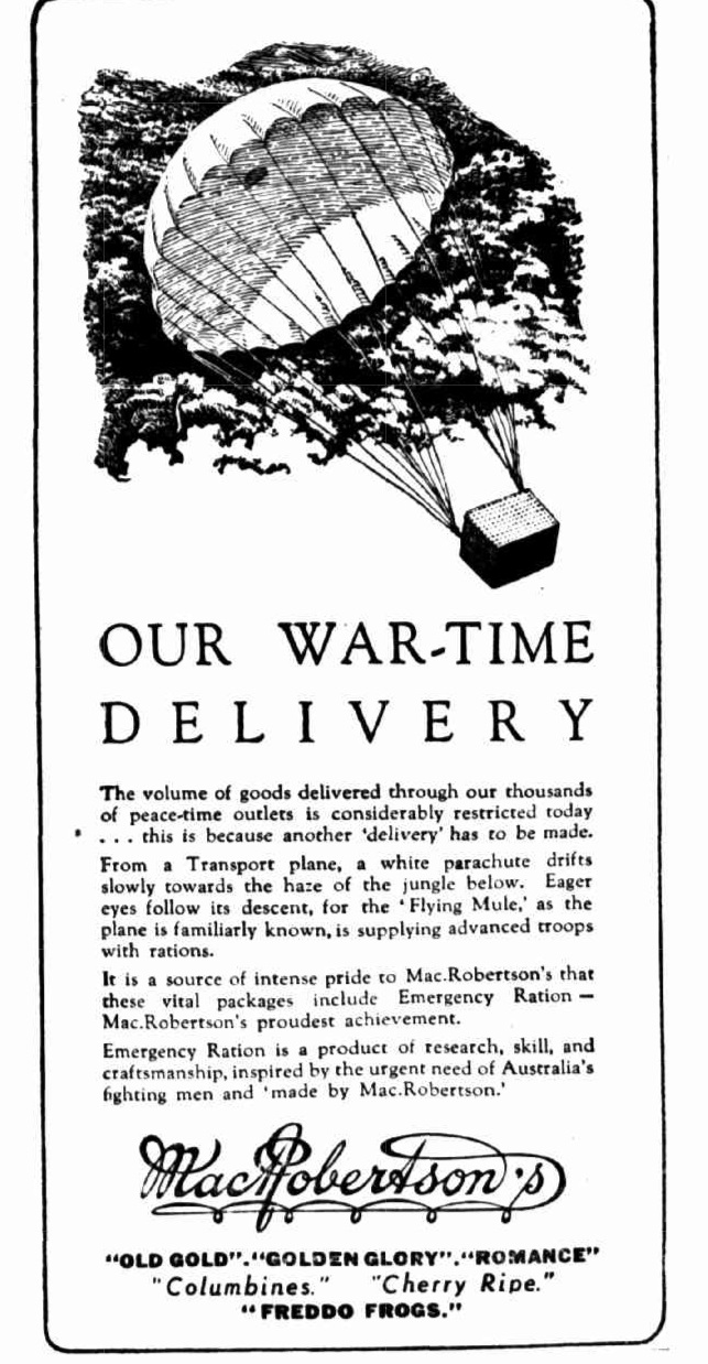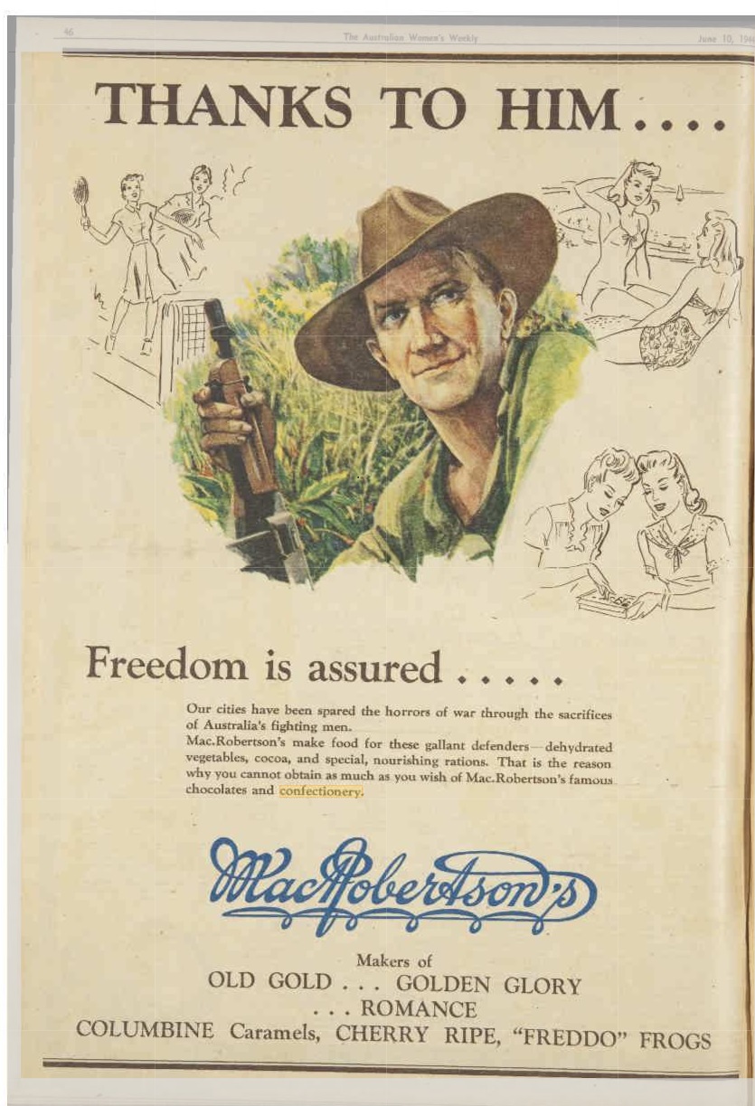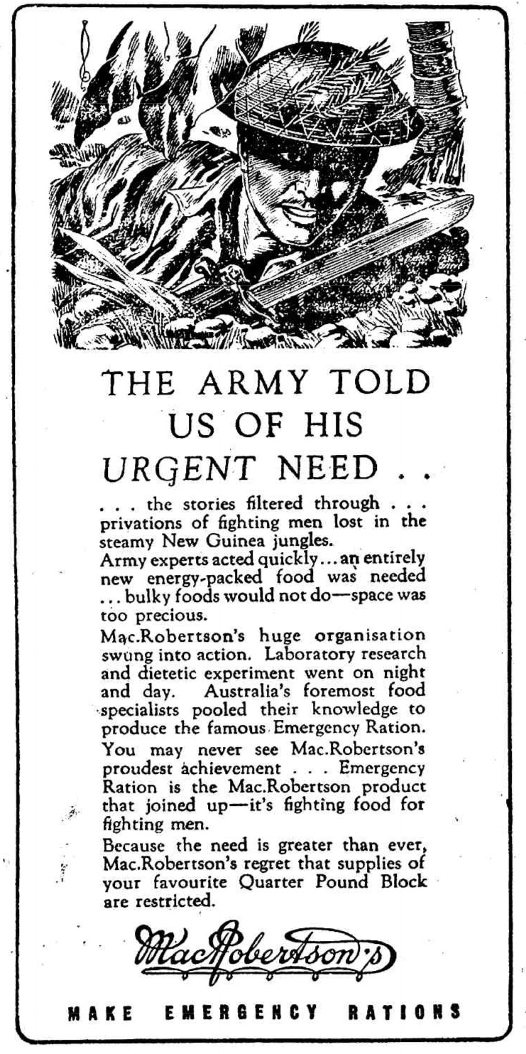 "MacRobertson's have a body of returned. soldiers on 4000 acres of land in Queensland, situated round about Kingdory, where they grow the maize for the glucose. They also have timber mills at Warburton to supply material for the casks. In consequence of the Bacchus Marsh people doubling the price of condensed milk, Mr. MacRobertson joined in with, other confectioners and started manufacturing condensed milk for useo in the trade. This ultimately resulted in one-Pound tins being put on the market for the general public under the name of 'Lifeguard" condensed milk. The bi-products of glucose are mainly Dandy Starch, salad oil, and cream korn flour." CHOCOLATE SOLDIERS (1922, October 14). Smith's Weekly (Sydney, NSW : 1919 - 1950), p. 11. Retrieved from http://nla.gov.au/nla.news-article234278838