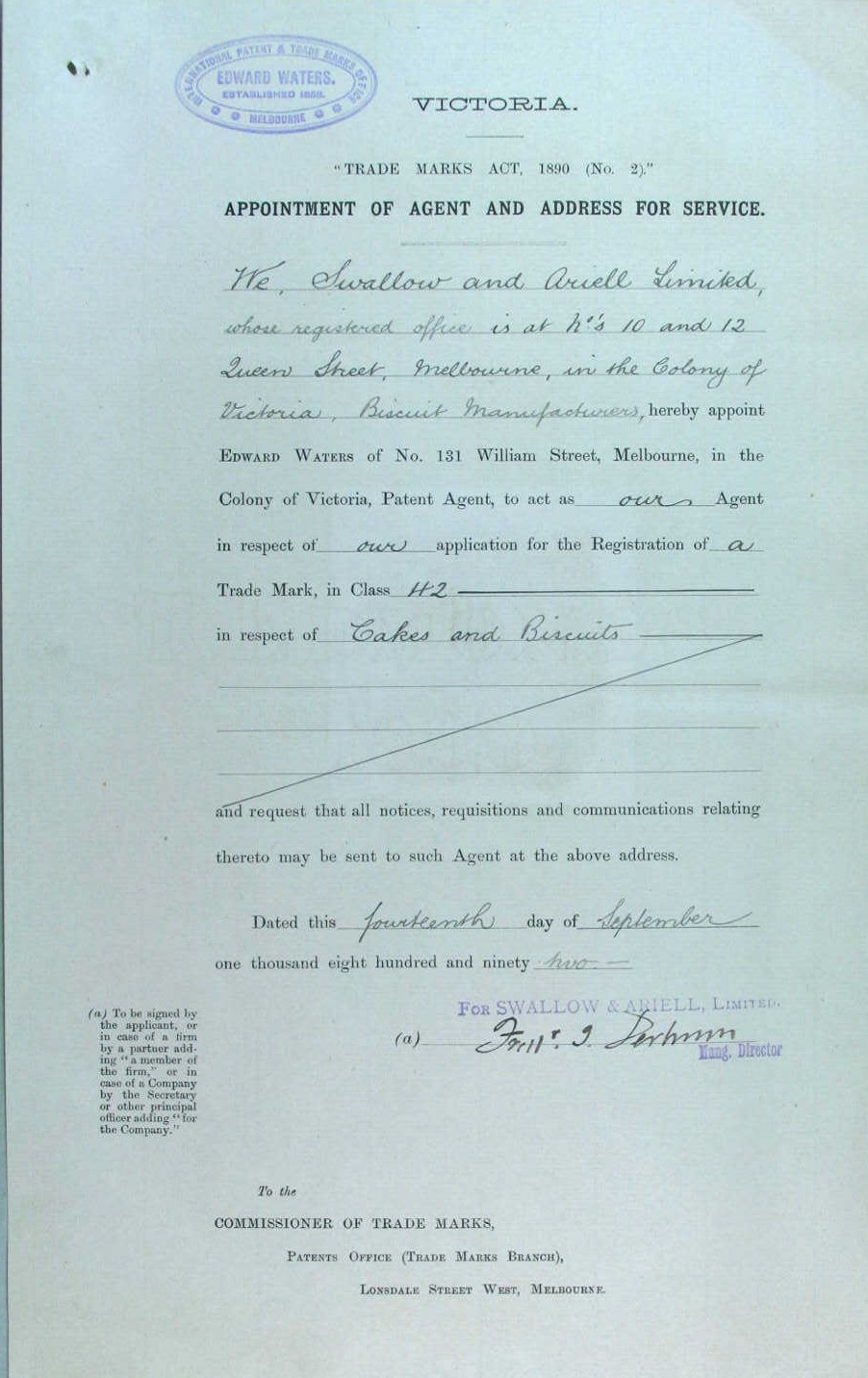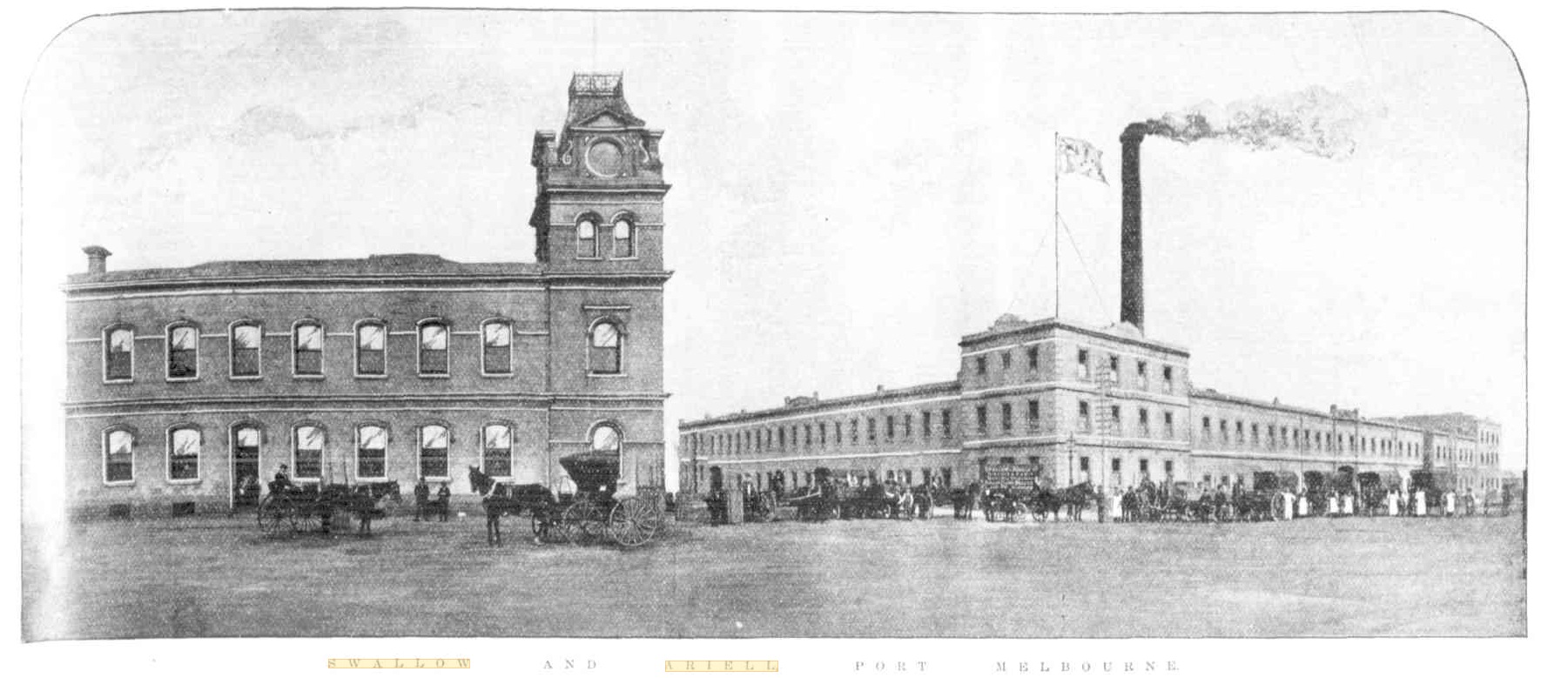 After Ariell died in 1875, F.T. Derham was appointed partner and managing director in 1877, and became his son in law. By the early 1880s their Port Melbourne factory extended to 3 acres (1.2 ha), and the company owned flourmills and sugar plantations in the Goulburn Valley and at Cairns in Northern Queensland, where Thomas Swallow passed away in 1890. With no equal outside Great Britain, Swallow & Ariell were the fifth largest biscuit company in the world, manufacturing over 100 varieties, including the common ship biscuit (an original product) and meat biscuits (apparently taken by Burke and Wills on their ill-fated expedition). The company also boasted popular sideline products, including cakes, plum puddings, ice-cream and dried fruit.