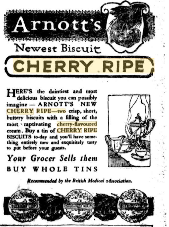 In May 1924 Arnott's launched their 'Cherry Ripe Biscuit' - one of several biscuits then available by this Newcastle born company and an item that would continue to be part of their range for decades.