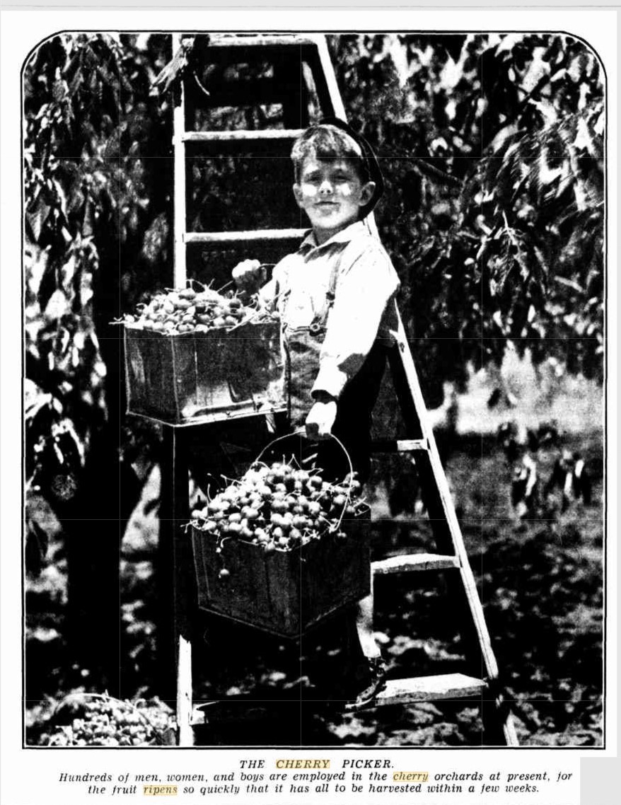 THE CHERRY PICKER. Hundreds of men, women, and boys are employed in the cherry orchards at present, for the fruit ripens so quickly that it has all to be harvested within a few weeks.
