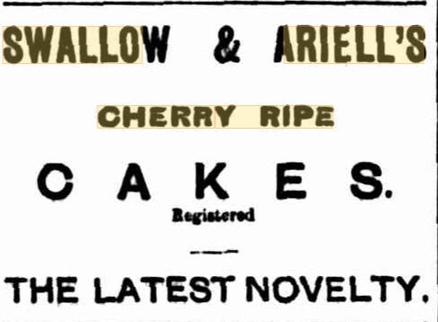 Cherry Ripe used as a name for a sweet in Australia first came through as a cake and then a biscuit, the cake sold by Australia's first biscuit company, founded in 1854 by Thomas Swallow (1823-1890) who had a partner within five years he had taken in Thomas Harris Ariell and became Swallow & Ariell Ltd.