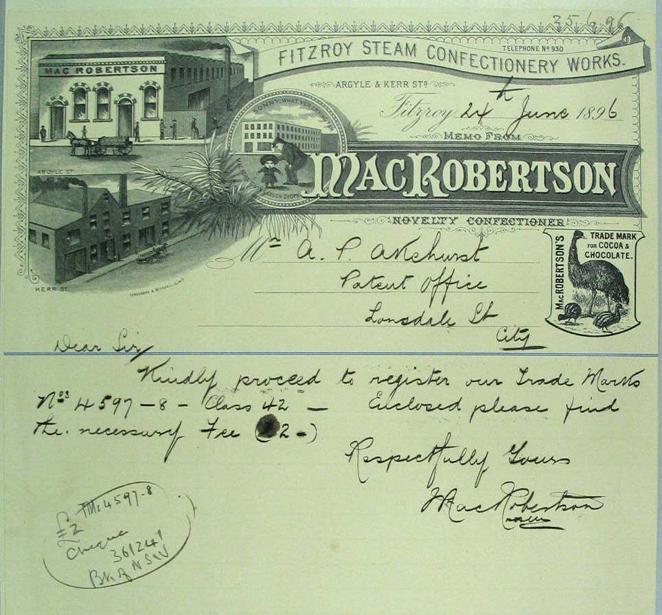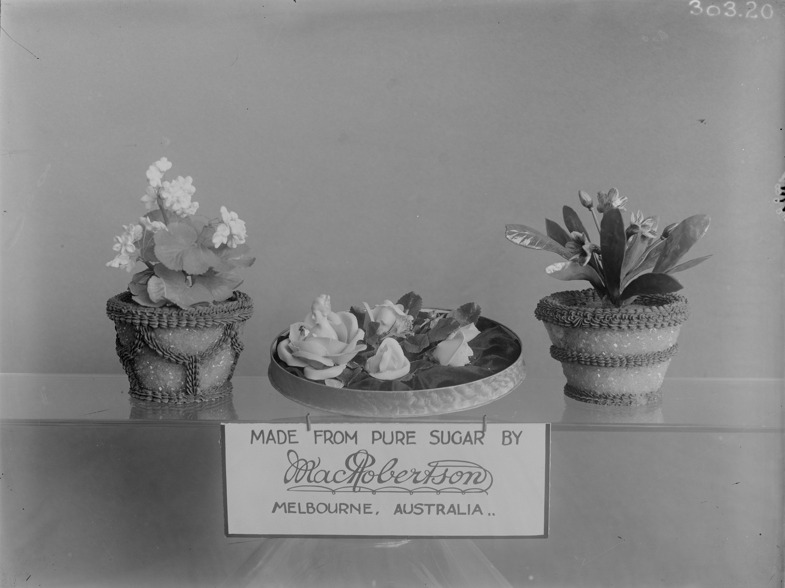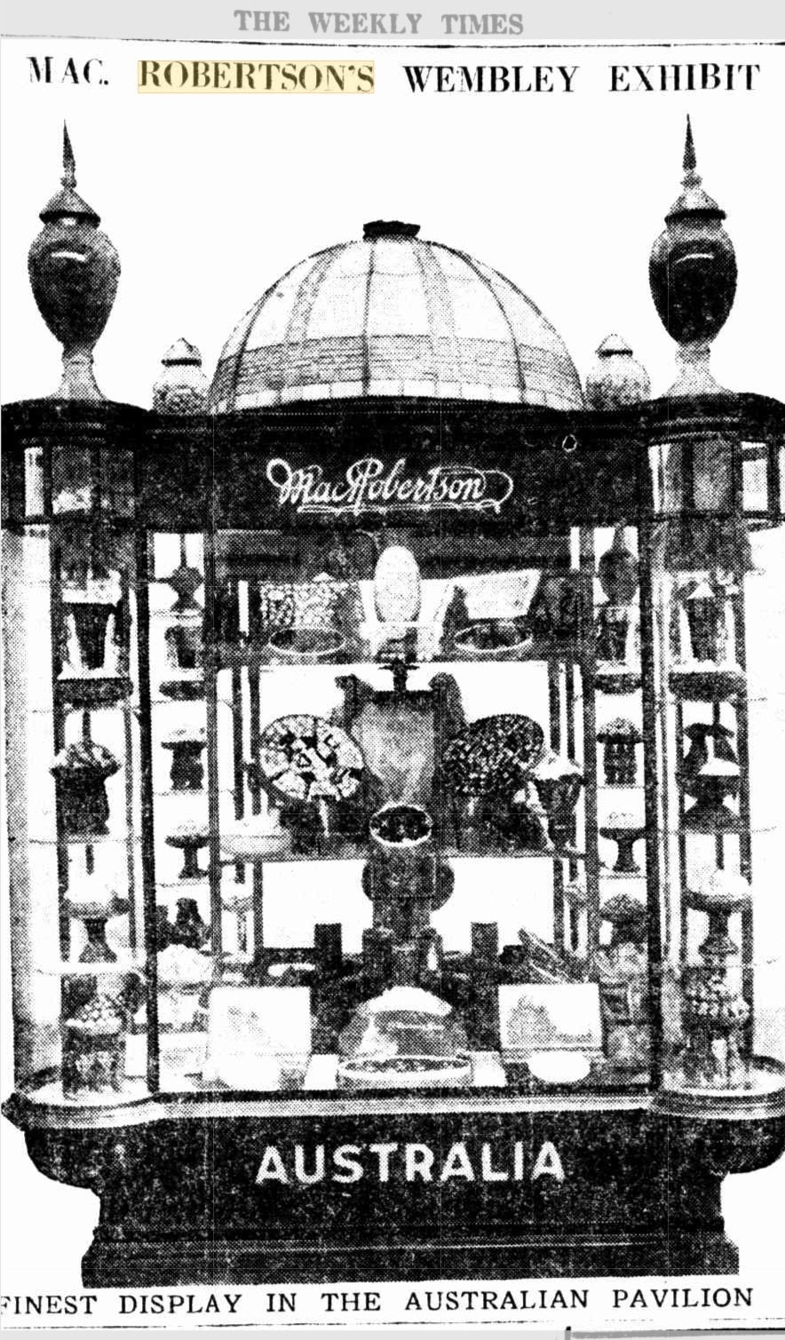 On his arrival at 11 a.m. he was driven between cheering lines of employees holding gay flags and streamers, and his car was followed by the brass band of the factory, playing "Hail the Jubilee'' and ''Australian Kangaroos, ' the latter tune being, a composition of Mr. Mac. Robertson. On entering the factory he was escorted to the exact site where, on 10th June, 1880, he had begun making sugar animals with a nail can and a pannican and from behind the original nail can he addressed his employees. He had started, he said, with a capital of less than twenty shillings, but his capital was slightly more now. He had been assisted by many able workers, and the concern was now the largest of its kind in the Commonwealth. When abroad in 1920 he had seen nothing to equal it. His greatest help had been from his mother, who had encouraged and inspired him. After placing under a stone a small bottle, in which was sealed a brief record of the business, Mr. Mac. Robertson was escorted to the showrooms, where a replica of the original bathroom in which operations were commenced had been placed close to a model of the 23 Fitzroy factories now in full operation. Later he addressed a huge crowd of employees from a lorry in Gore street, and was enthusiastically received. The Week on the Mainland. (1930, June 18). Advocate (Burnie, Tas. : 1890 - 1954), p. 9 (DAILY). Retrieved from http://nla.gov.au/nla.news-article84943037