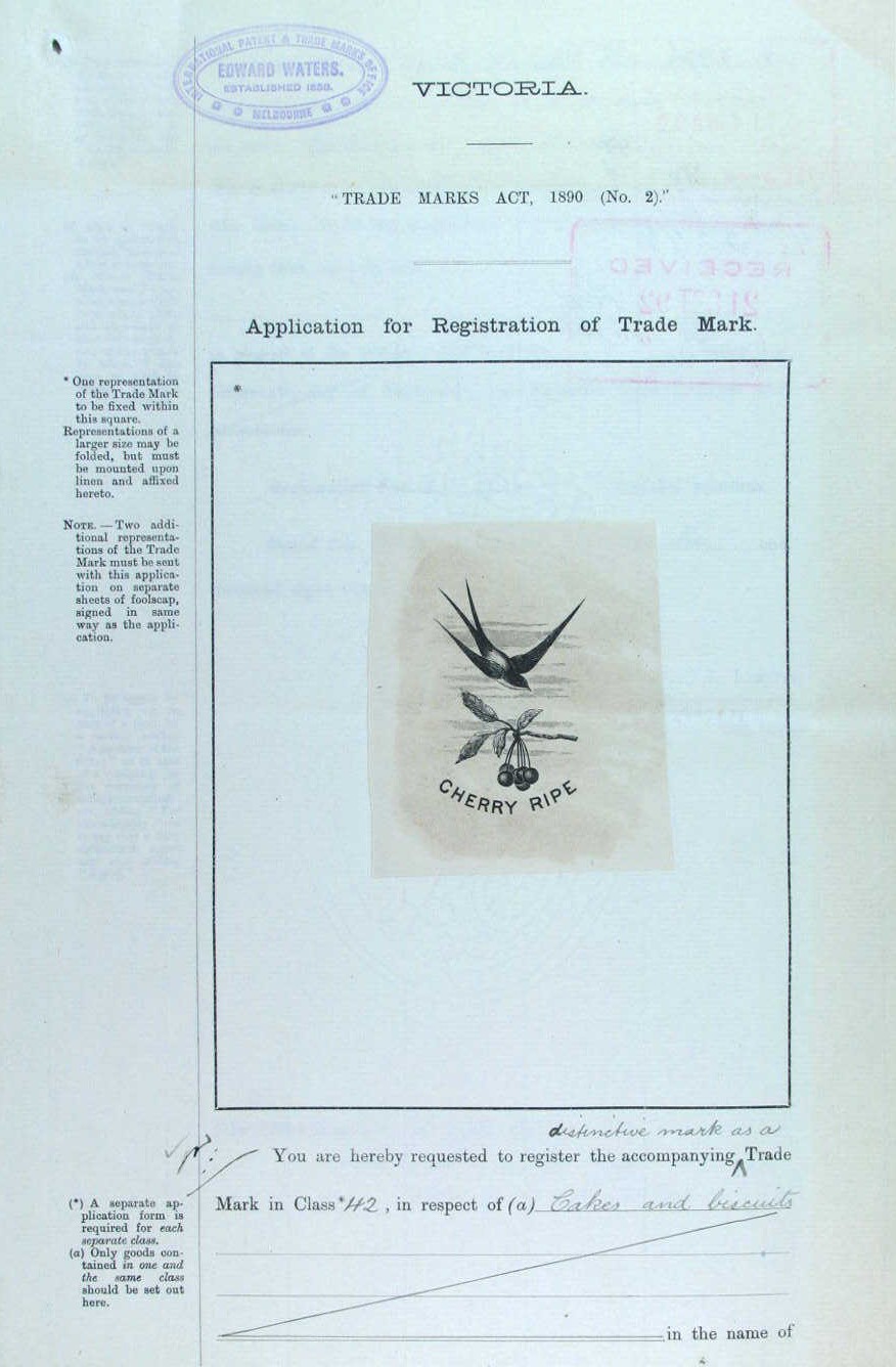Application for Trade Mark titled Cherry Ripe depicting swallow approaching a cherry branch in respect of cakes and biscuits - by Swallow and Ariell Limited - 1892 - National Archives of Australia