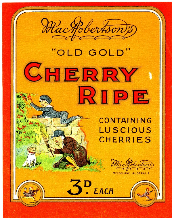 Many of the colourful packages featured poems or stories, like the boy who stole the cherries on the back of the cherry ripe wrapper. - David Robertson, grandson of the well-known Melbourne businessman and philanthropist, launching the exhibition, Nail Can to Knighthood : the life of Sir Macpherson Robertson KBE, hosted and curated by the Royal Historical Society of Victoria, July 14, 2015 to March 4th, 2016. From Transcription of his Address in opening the Exhibition.