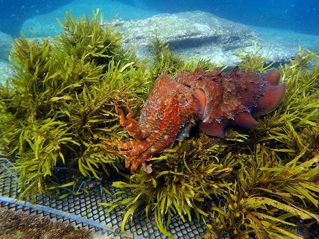 Image: A giant cuttlefish interacting with Crayweed restoration mats at Cabbage Tree Bay. Photo Ian Donato