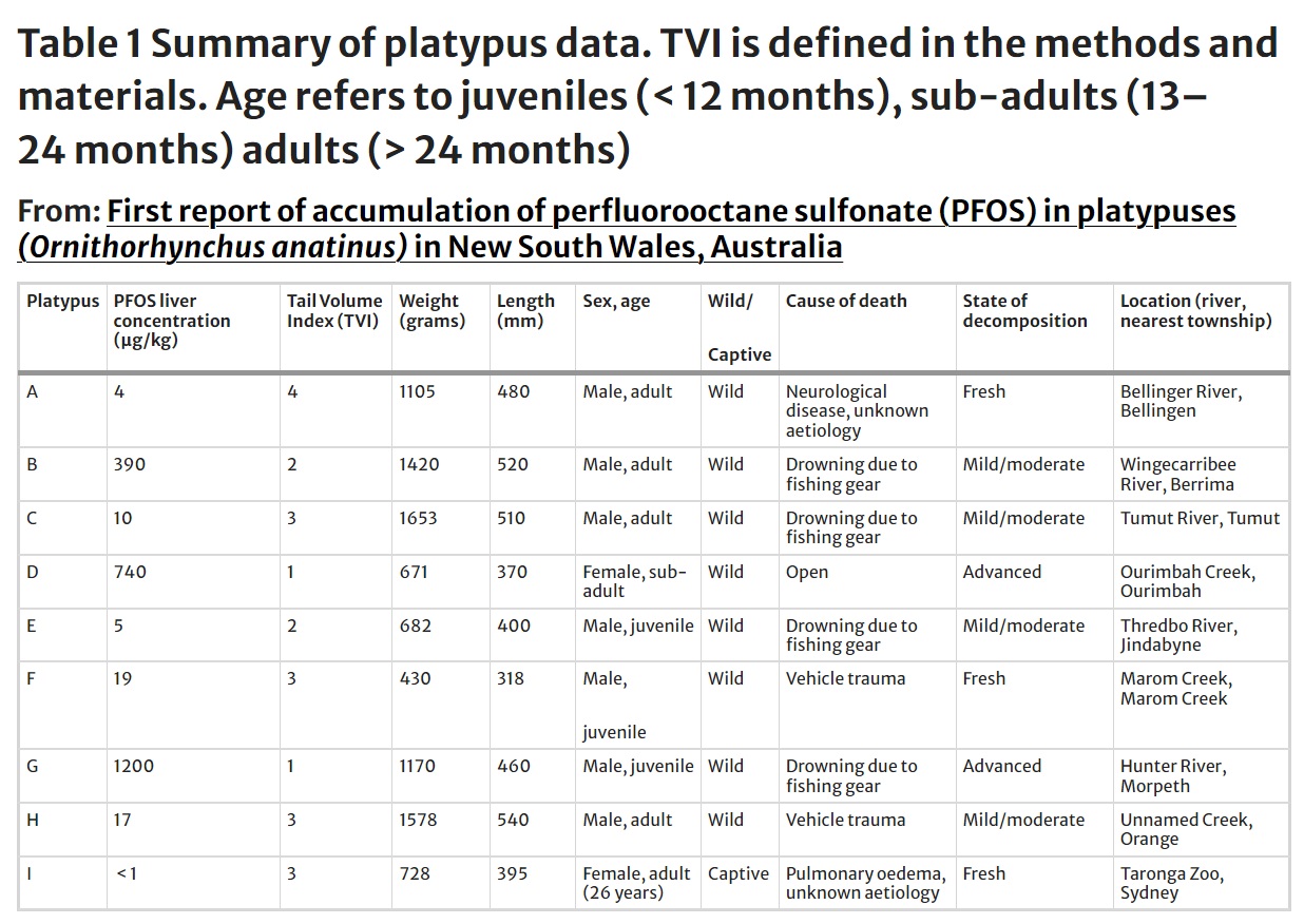 For more information, download and read, ‘First report of accumulation of perfluorooctane sulfonate (PFOS) in platypuses (Ornithorhynchus anatinus) in New South Wales, Australia’, here