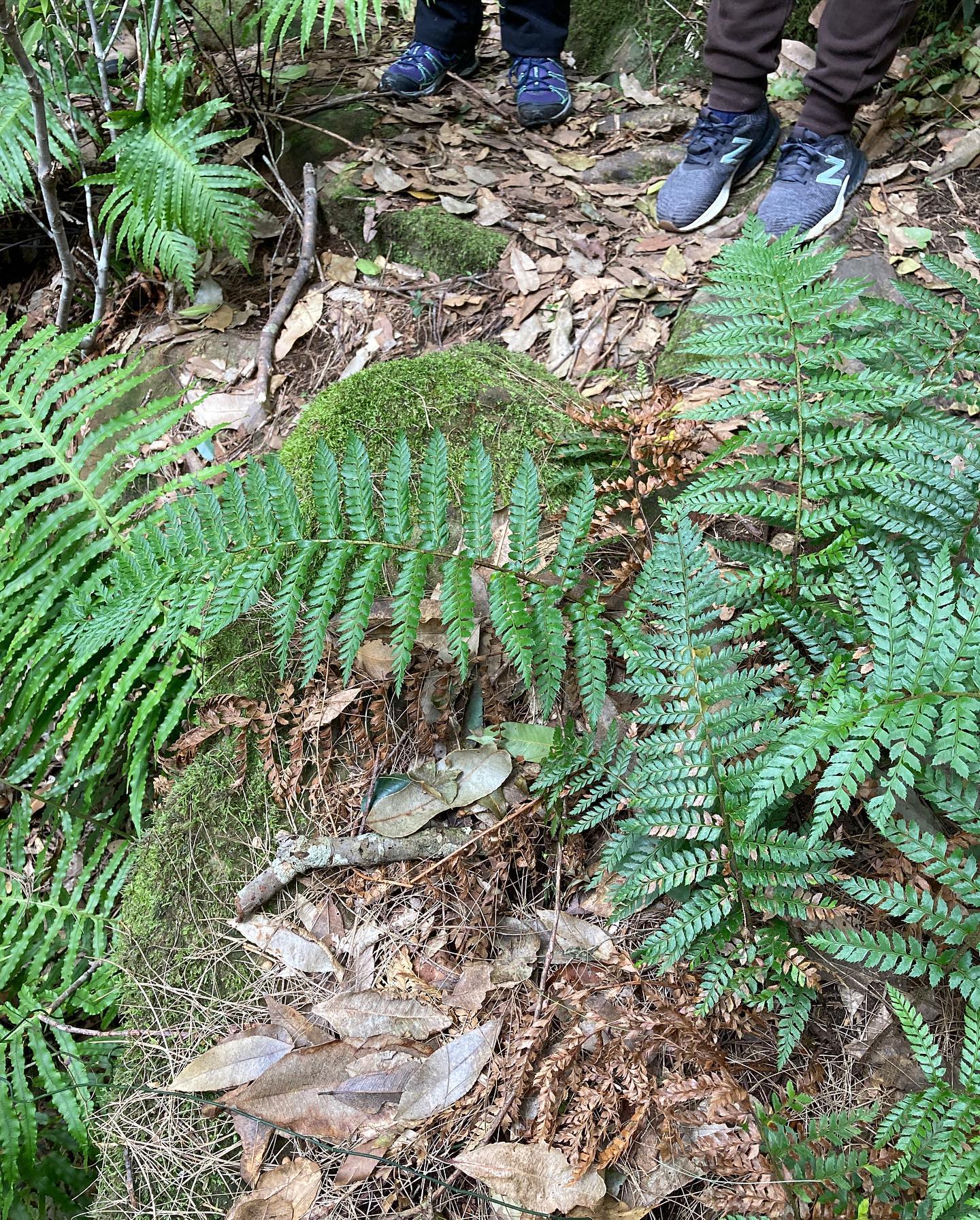 Mother Shield Fern, Polystichum australiense, as well as by spores, can reproduce by growing a tiny fernlet on the tip of each frond. When this touches the ground it takes root, and the fern patch spreads. This fern on right side on photo: