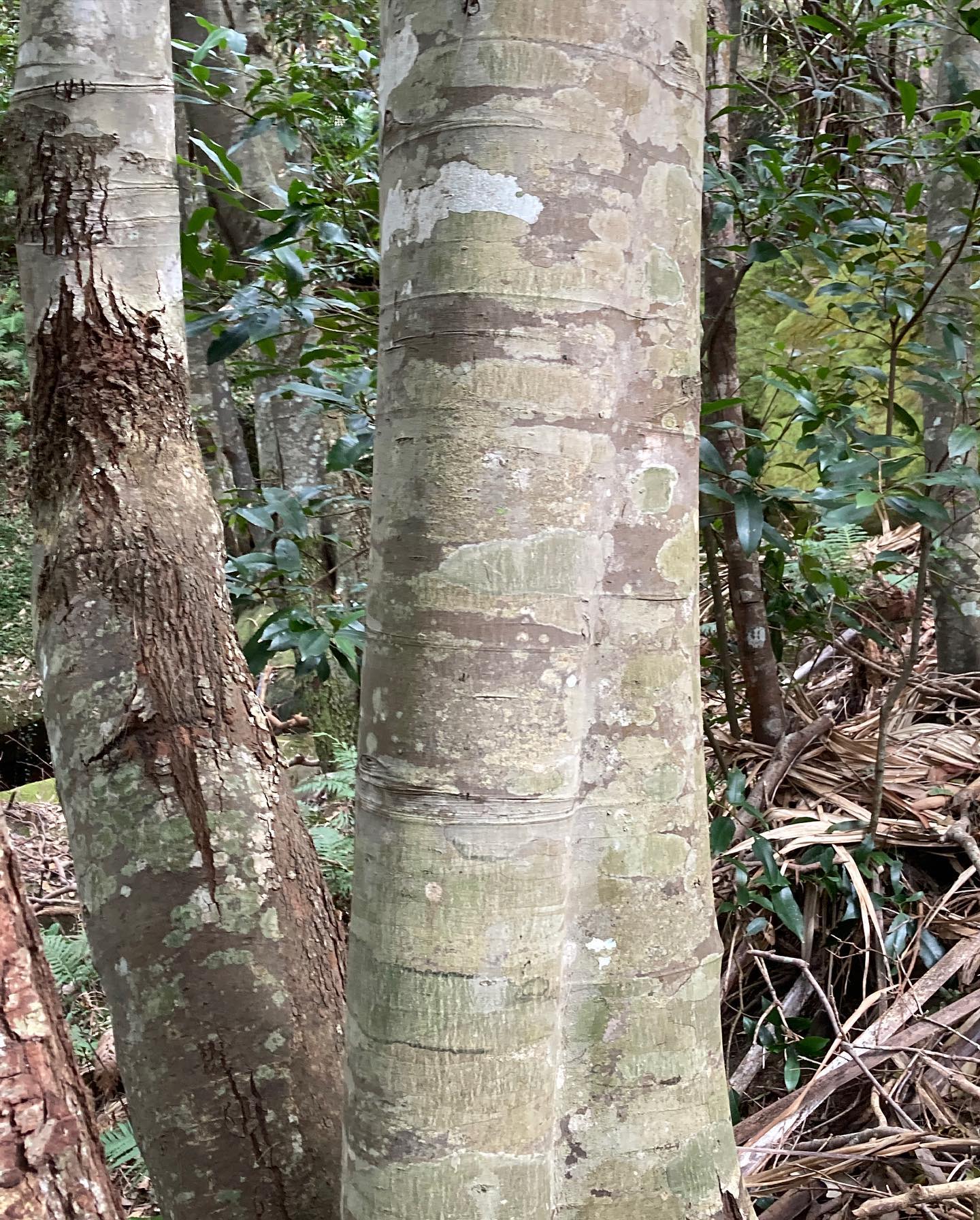 Coachwood apetalum bark with multicoloured patches of lichen: