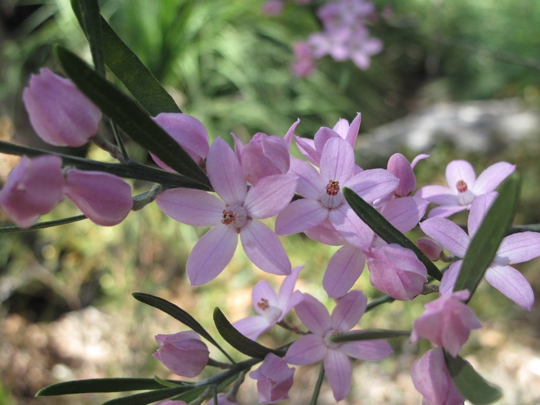 Pink Waxflower Eriostemon australasius. It has five petals. Its close relative Boronia has four. Both are in the Rutaceae plant family: