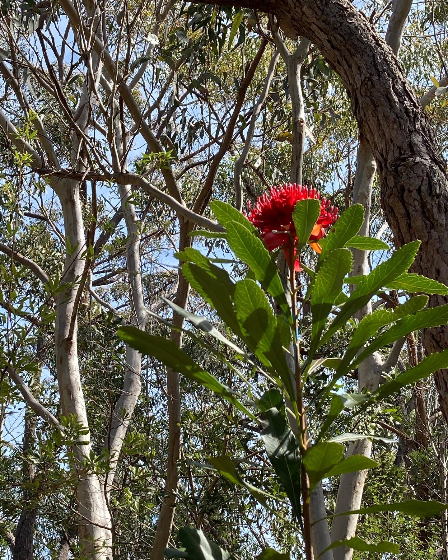 Waratahs glowing like beacons but with blue-painted stems to defeat flower thieves, yellow Pomaderris intermedia, and surprise! Christmas Bells: