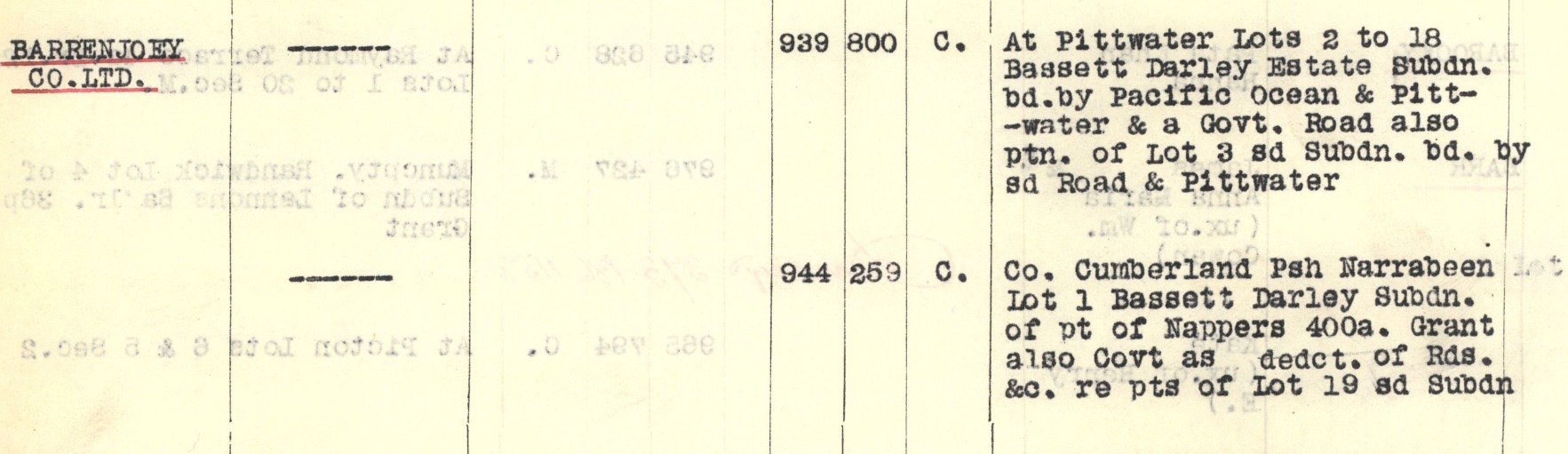 The Certificate of Title for the Barrenjoey Company Limited series is Volume 2289 – Folio 43, which will also bring up, if you use this to search through the Historical Land Records View (HRLV) those early lands sales until they sold what was left to the 1924 formed Palm Beach Lands company; See Vol-Fol: 3758-71 for the Palm Beach Land Co. phase.