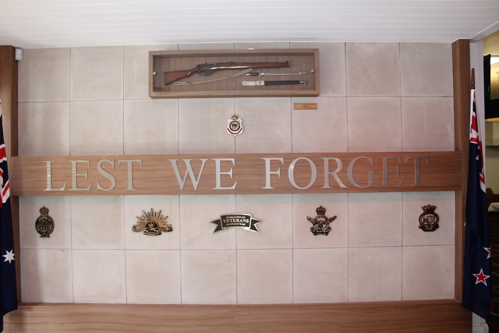 This refurbishment is best explained as being at four locations within the club, the first being the Entrance Foyer; as you enter the club you are introduced to a display of Service Badges and Plaques which is intended to set the which is intended to set the club’s desired subdued military ambiance. Some time ago, when this project was in its infancy, Mr. John Seaton, on behalf of the 77 Squadron, Royal Australian Air Force Association presented the Sub-Branch with an S.M.L.E. 303 Service Rifle for inclusion in the proposed Memorabilia Cabinet. This iconic rifle, serial number 35233, together with a 15 inch bayonet and scabbard resented by Mr. Bob Week have become somewhat a talisman for Members and are now permanently mounted in the foyer. The date for this opening was chosen in recognition of the 77th as it is the 66th Anniversary of when the Squadron began training on Gloster Meteors prior to being moved to Iwakuni Japan.