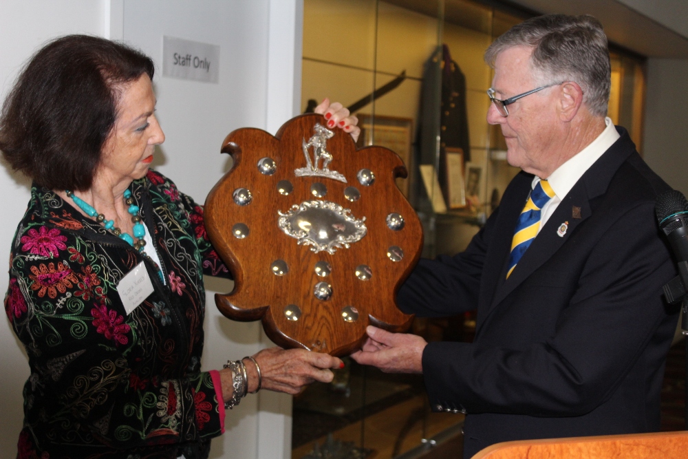 Gloria Xuereb presenting the shield to Palm Beach RSL Sub-Branch President Mark Ferguson