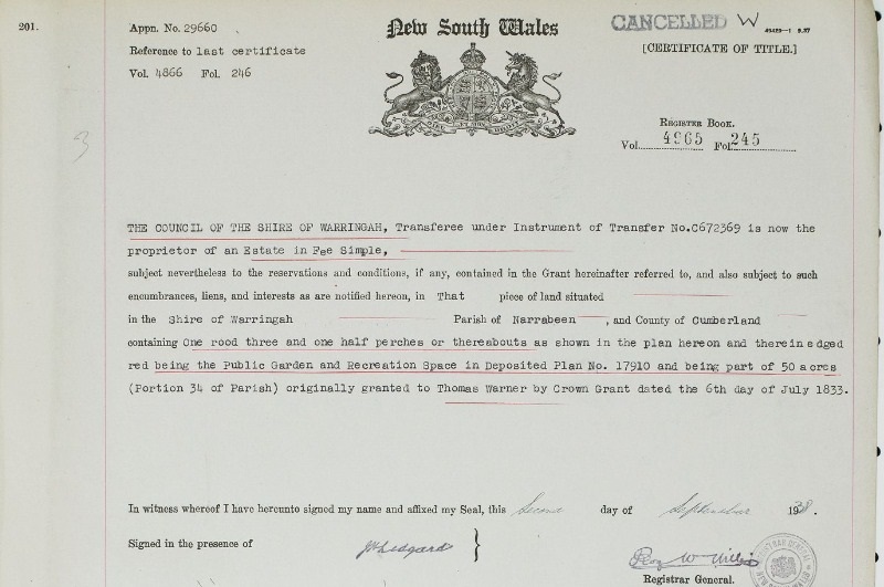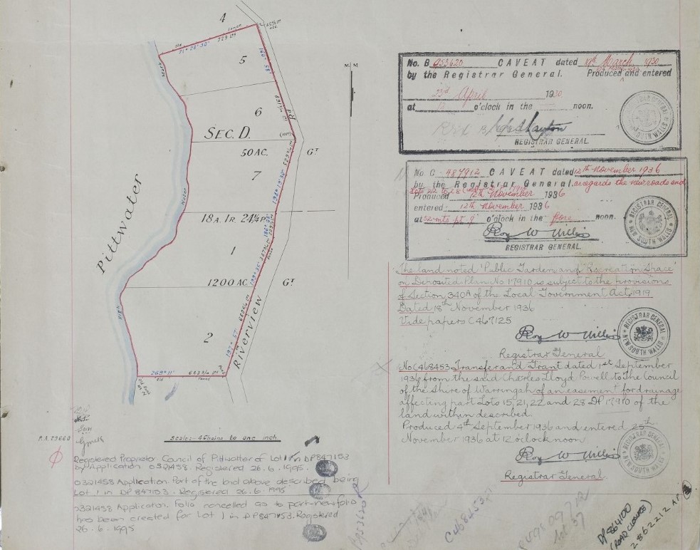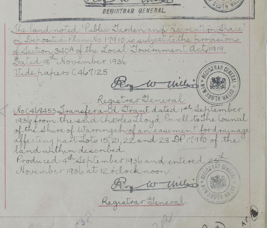 The Certificate of Title for the 18+ acres shows the ‘Public Garden and Recreation Space’ bequeathed to Warringah Shire Council on November 18th 1936 (Deposited Plan 17910), and a later certification for Pittwater Council on June 26 1995. An easement for drainage affecting part of Lots 15, 21,22 and 28 DP17910, transferred from Mr. Powell to the council occurs September 1st 1936.