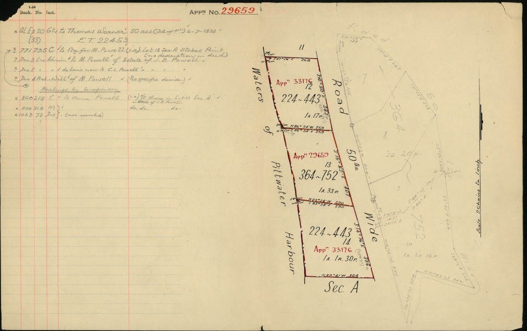 PA 29659 Title: Primary Application - John Benjamin Powell, Stokes Point Parish of Narrabeen County of Cumberland. Contents Date Range: 21-08-1928. PA 29659. Title: Primary Application - Charles Lloyd Powell 3 roods 27 perches in Riverview Road and on Pittwater in Shire Warringah Parish Narrabeen County Cumberland Volume 4304 Folio 207. Contents Date Range: 21-08-1928 to 24-07-1929