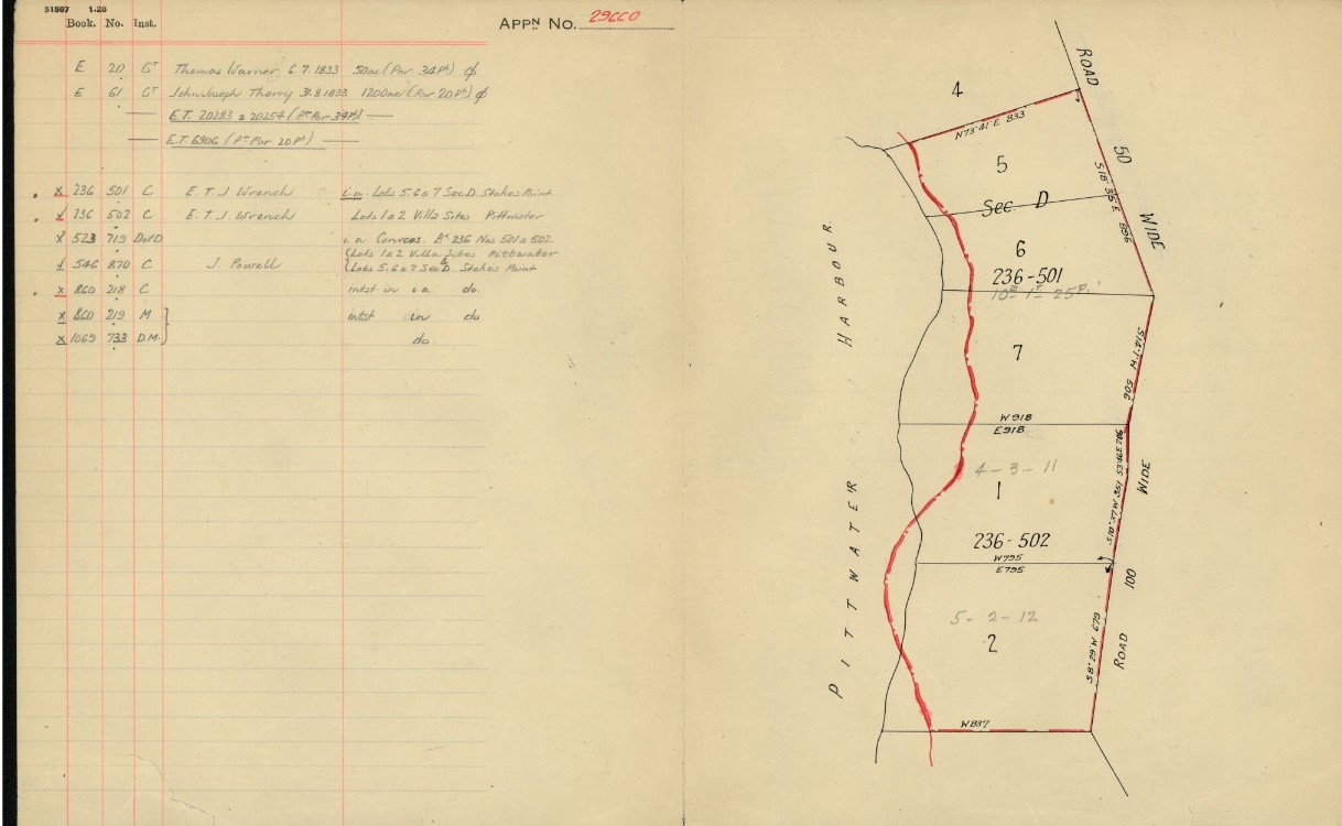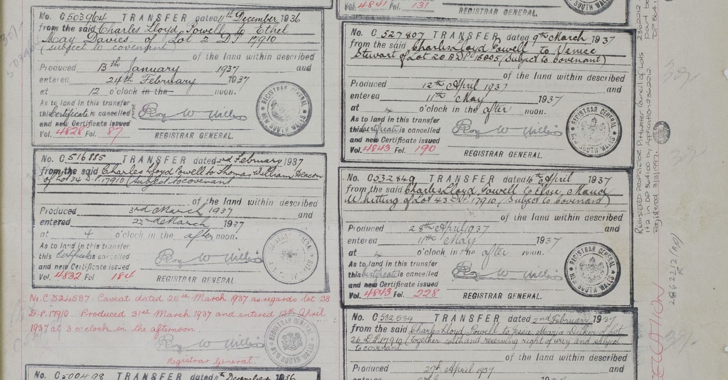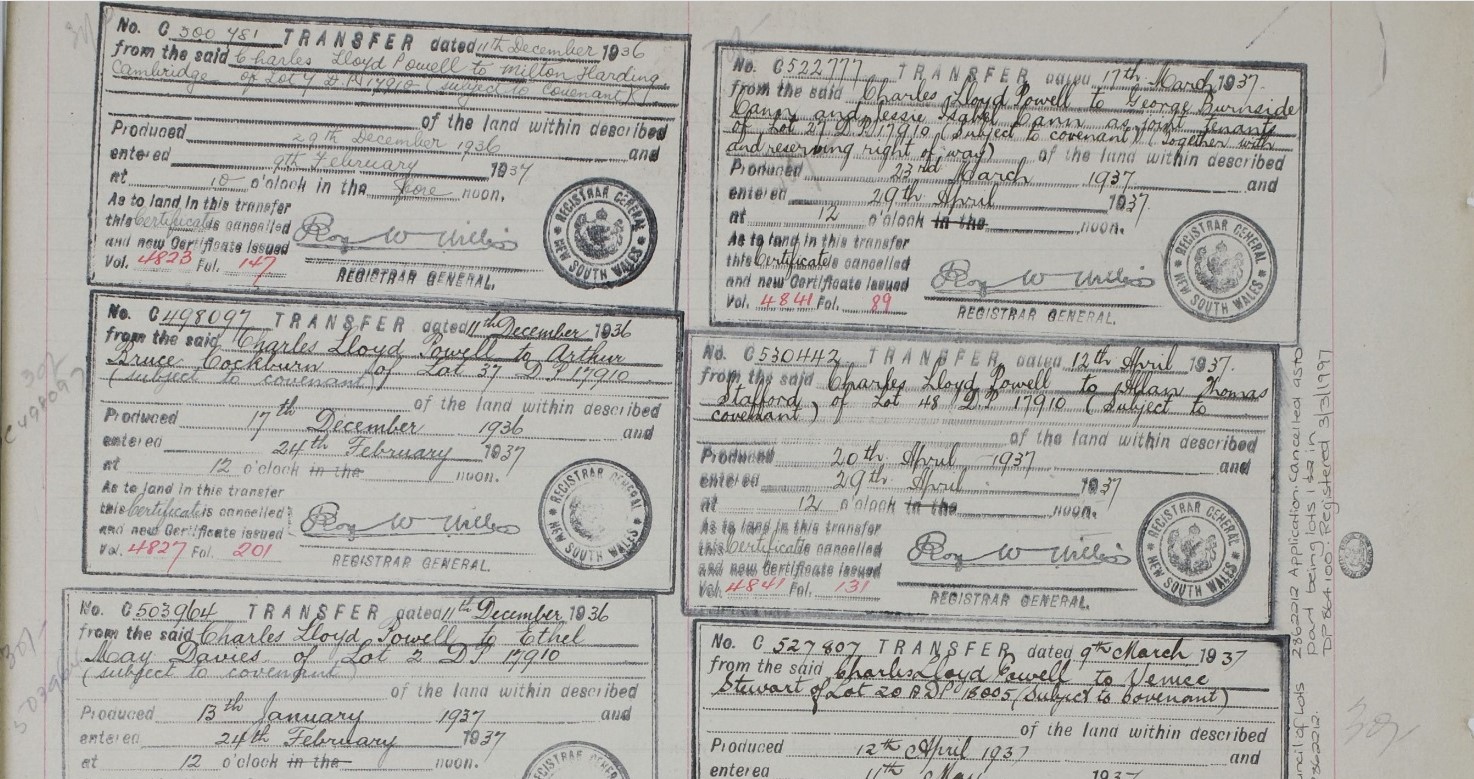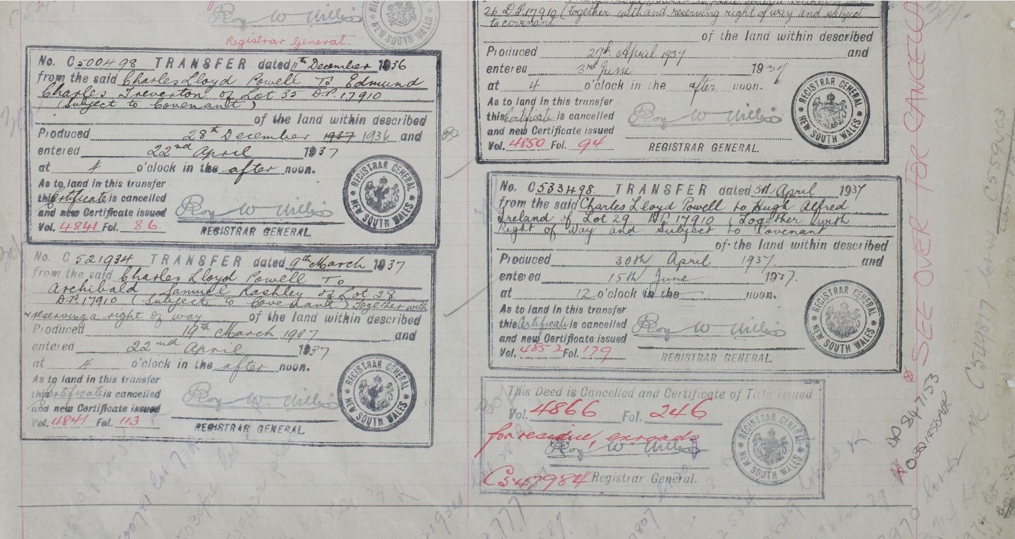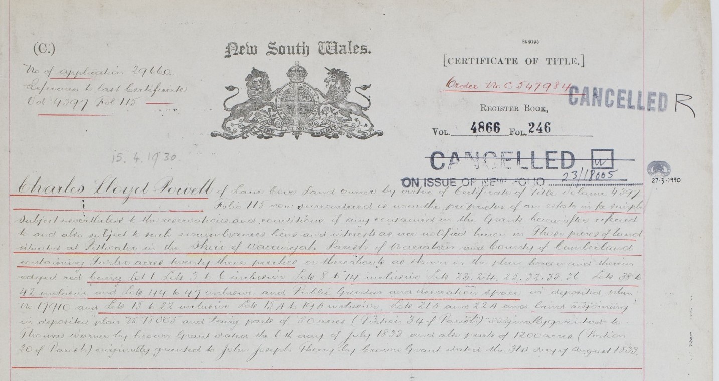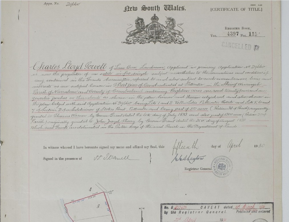 The NSW Records provides: 'PA 29660 Title: Primary Application - John Benjamin Powell Parish of Narrabeen County of Cumberland, Contents Date Range; 21-08-1928 to 21-08-1928. PA 29660; Title; Primary Application - Charles Lloyd Powell 18 acres 1 rood 24 1/4 perches on Riverview Road and on Pittwater in Shire Warringah Parish Narrabeen County Cumberland Volume 4397 Folio 115. Contents Date Range; 21-08-1928 to 15-04-1930'.