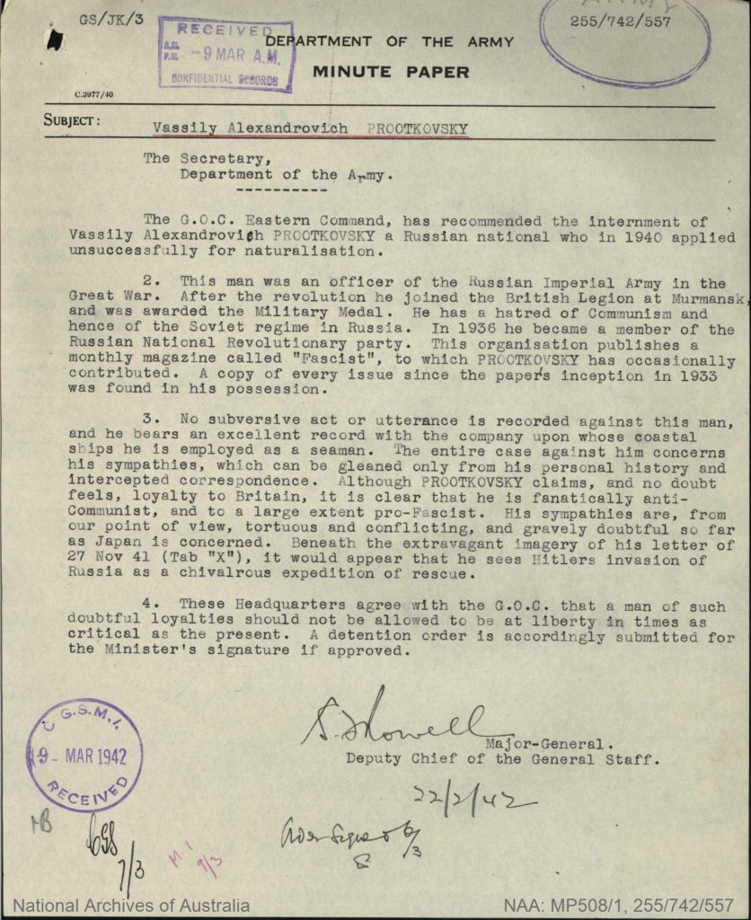 - NAA: MP508/1, 255/742/557, Vassily Alexandrovich PROOTKOVSKY - Detention Order