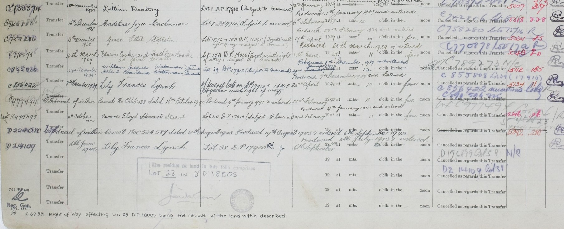 Grace Stapleton Lots 13 and 14 in November 1947 Vol-Fol: 5830-31, sells two lots residue goes into Vol-Fol: 6779-103, being Lots 12, 13, 14 and 14A, but then one lot sold comes back to 'J T Stapleton' soon afterwards.