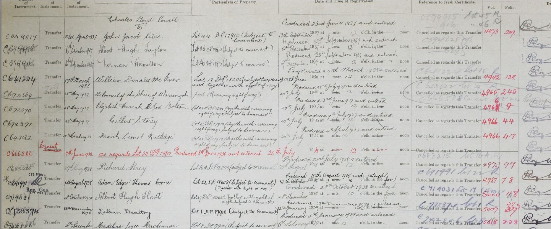 In Vol-Fol 4304-207, 3 roods and 27 perches, Charles Lloyd Powell transfers Lot 2, of 29 perches, to Leslie Thomas Powell of Sydney, 'Company Director' (Vol-Fol: 4983-203) on October 28 1938. On November 25 1938 he sells this to Ann Craws Law of Homebush, Widow. She sells, on December 2 1938, to May Janet Downing, wife of James William Downing of St. Ives with the transfer taking place on December 16 1938. May Downing sells the property to William George Medbury (1915-2001) of Coogee, Supply Officer, on February 4 1942 with the transfer taking place on February 13 1942. On November 14 1956 Alfred Ivan Frank Silver and his wife Eileen Mary Silver, both of Gladesville, become joint tenants. Ian Adrian Dopper, of Garran, Project Manager, and his wife, Lana Pamela Margaret Dopper, become joint tenants on April 11, 1978.