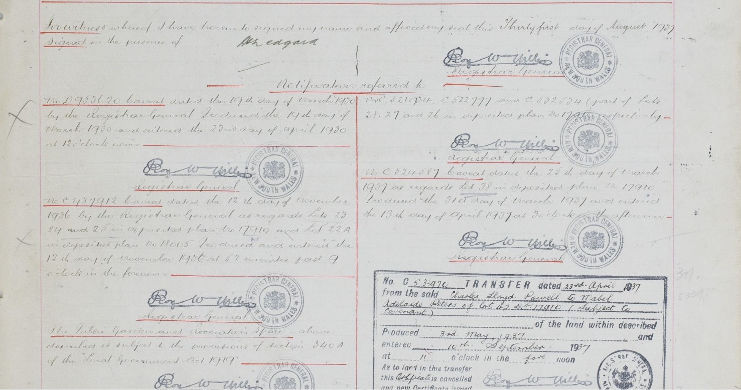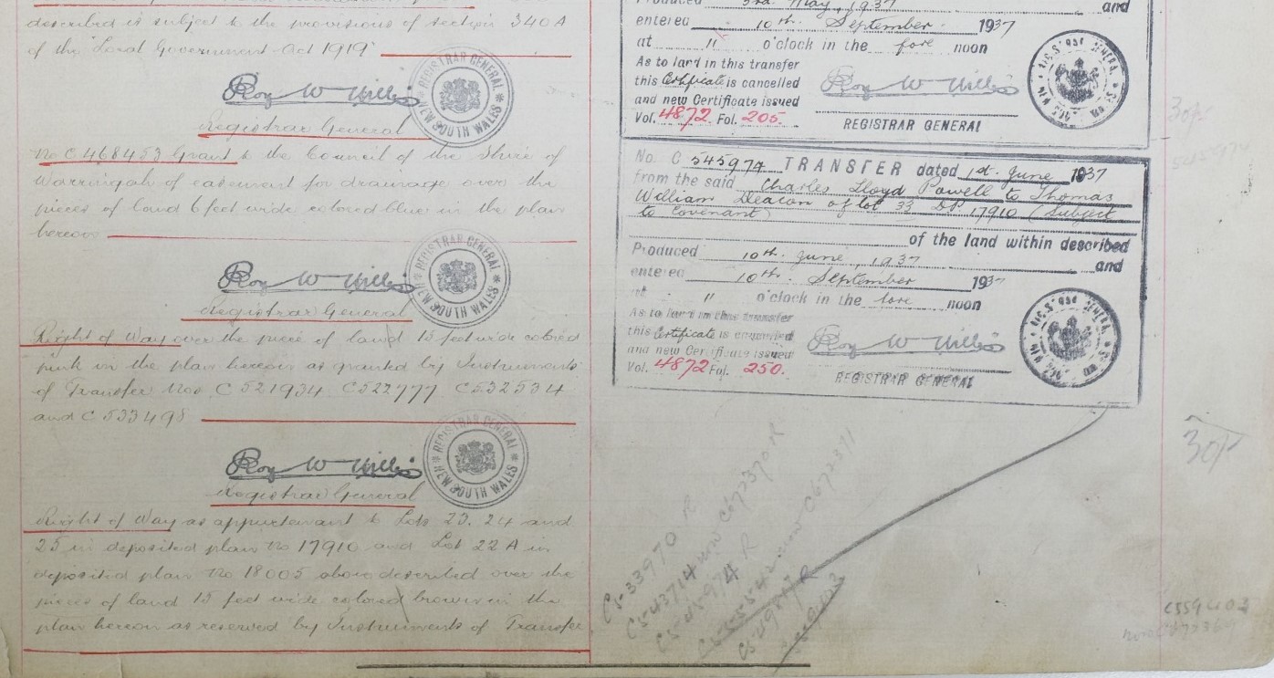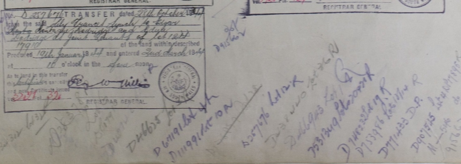 Lot 35 (Vol-Fol: 4841-86) sold to Edmund Charles Treverton (1876-1949) of 'Darlinghurst, gentleman'. The property, called 'Redleaf', goes to his widow Minnie May in 1949 [nee Benson born January 31 1880 in Collingwood Vic. Parents : Richard Benson (1850–1938) and Mary Murdoch (1857–1935) - they married in 1903 in Victoria] and when she passes away on June 29 1952 the property is sold in 1952 to Norman Richard Benson of Lane Cove, Linotype Operator.