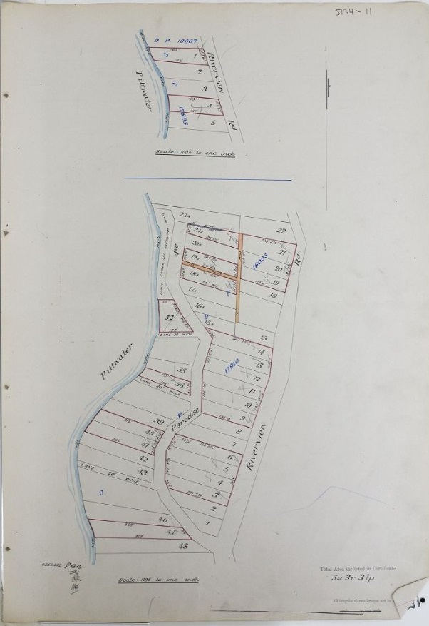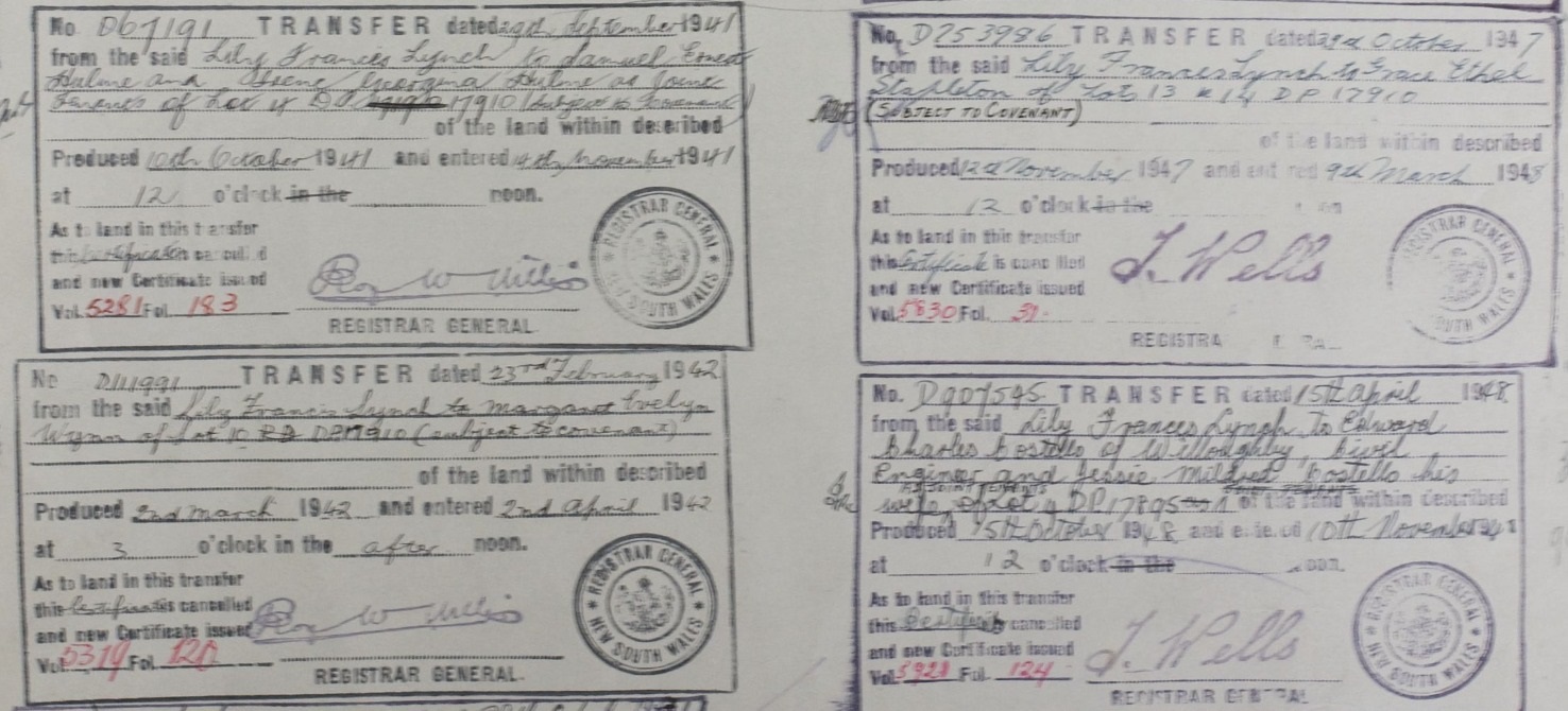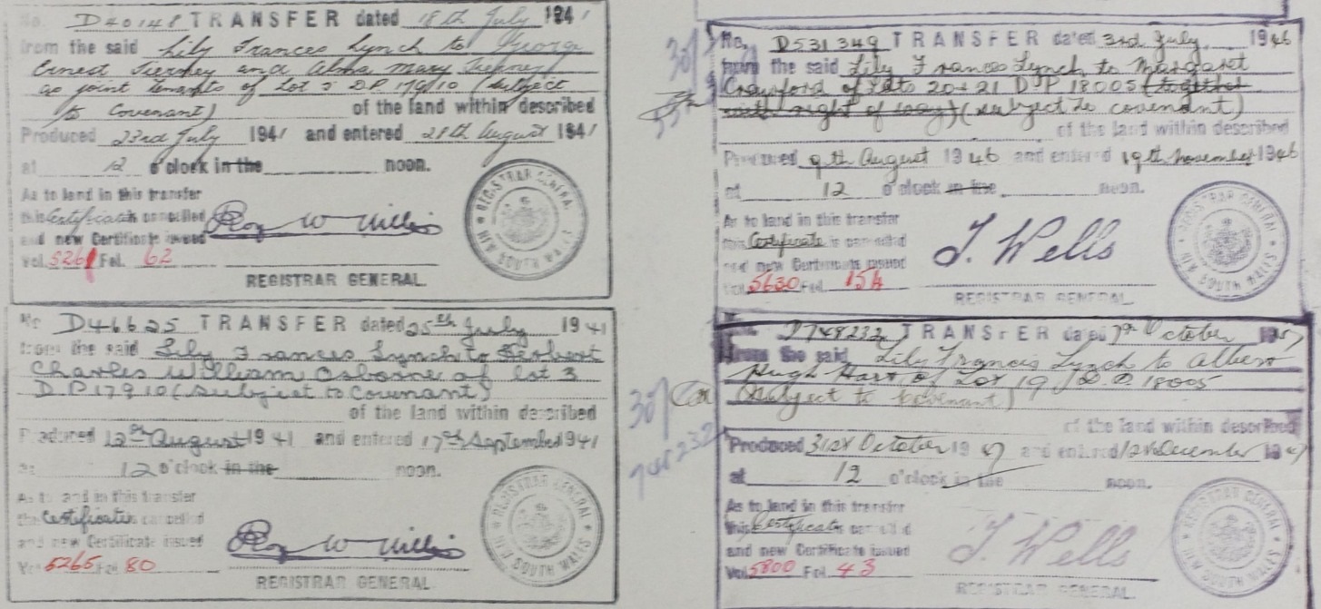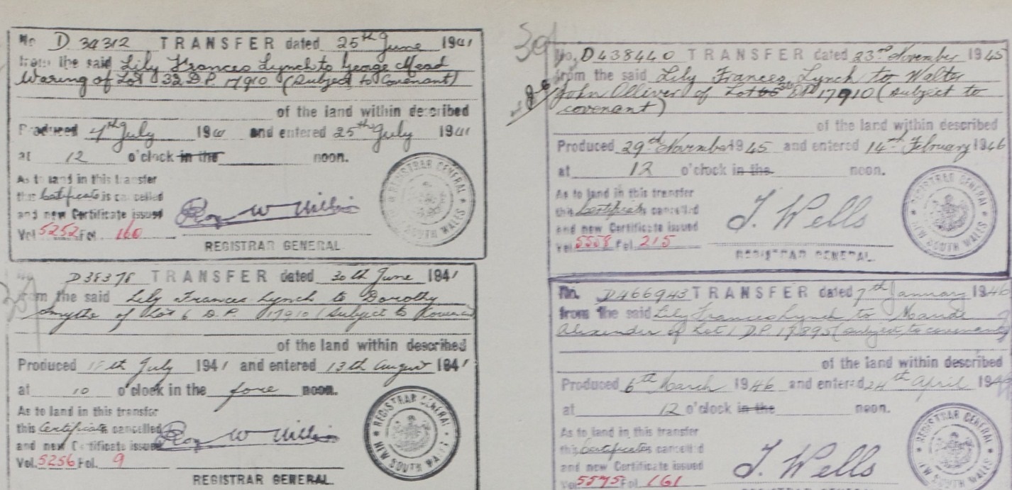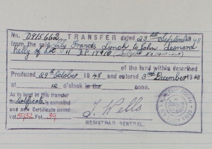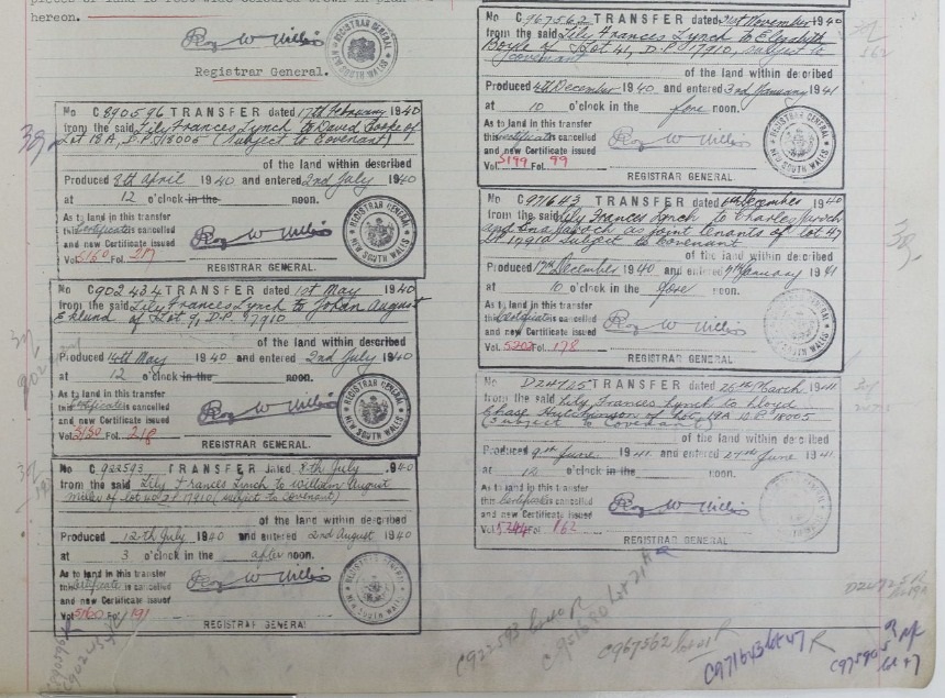 Of the 21+ acres, 5 acres, 3 roods and 37 perches was sold on to Lily Frances Lynch wife of George, Foreman, Parramatta (Vol-Fol: 5134-11):