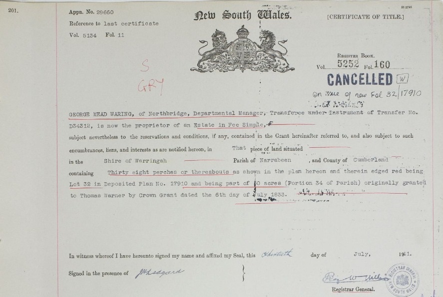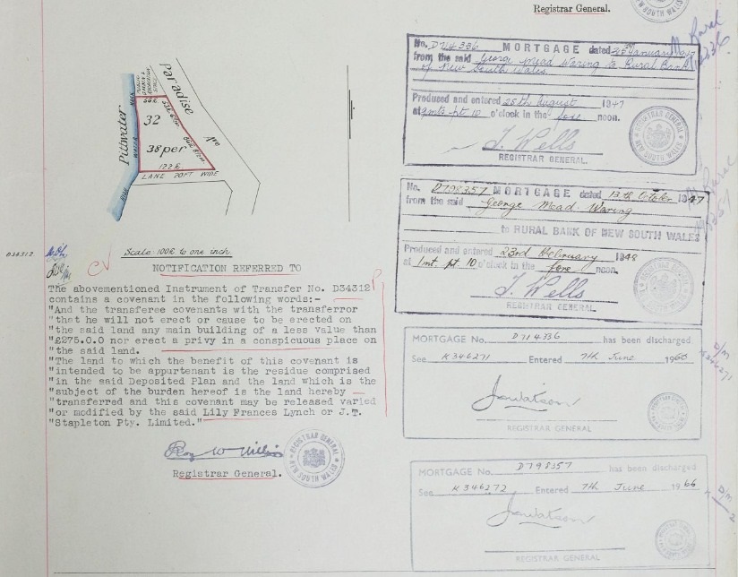 Lot 32, where the Powell holiday cottage was, of 38 perches: sold to George Mead Waring of Northbridge, 'Departmental Manager' in July 1941 (Vol-Fol: 5252-160) - and becomes both he and Nellie Margaret Waring as tenants in common in equal shares on May 3rd, 1985:
